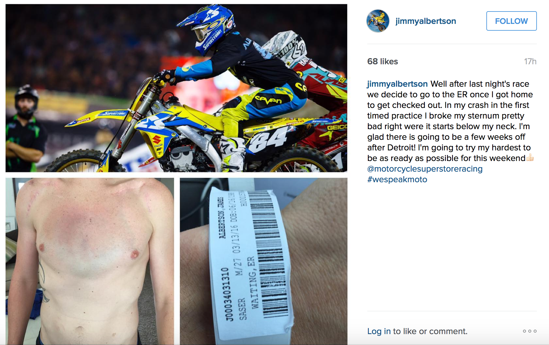 Motorcycle Superstore Suzuki’s Jimmy Albertson raced the 250SX East Region main event in Toronto with a broken sternum, he announced on Instagram last night. Albertson said he sustained the injury in a crash in the first timed practice.