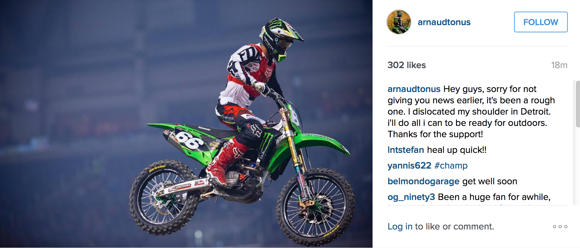Monster Energy/Pro Circuit Kawasaki’s Arnaud Tonus announced on Instagram today that he would miss the remaining five rounds of the Monster Energy Supercross 250SX East Region after dislocating his shoulder in Detroit.