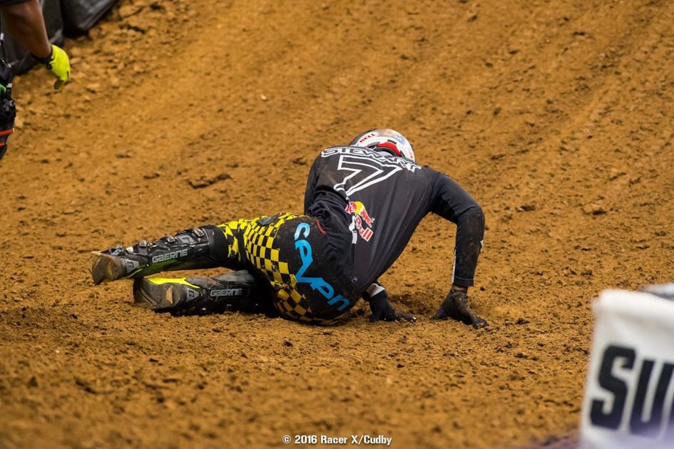 James Stewart attempted to race this weekend after hurting his ankle last week in Indianapolis, but re-aggravated a back injury during practice and was experiencing back spasms. He tried to race his heat, but things didn’t go great. A line change from Stewart ended up with Weston Peick getting into the back of him, leaving Stewart on the ground. Stewart rode the rest of the heat, but the back spasms continued back in the pits and that was it.