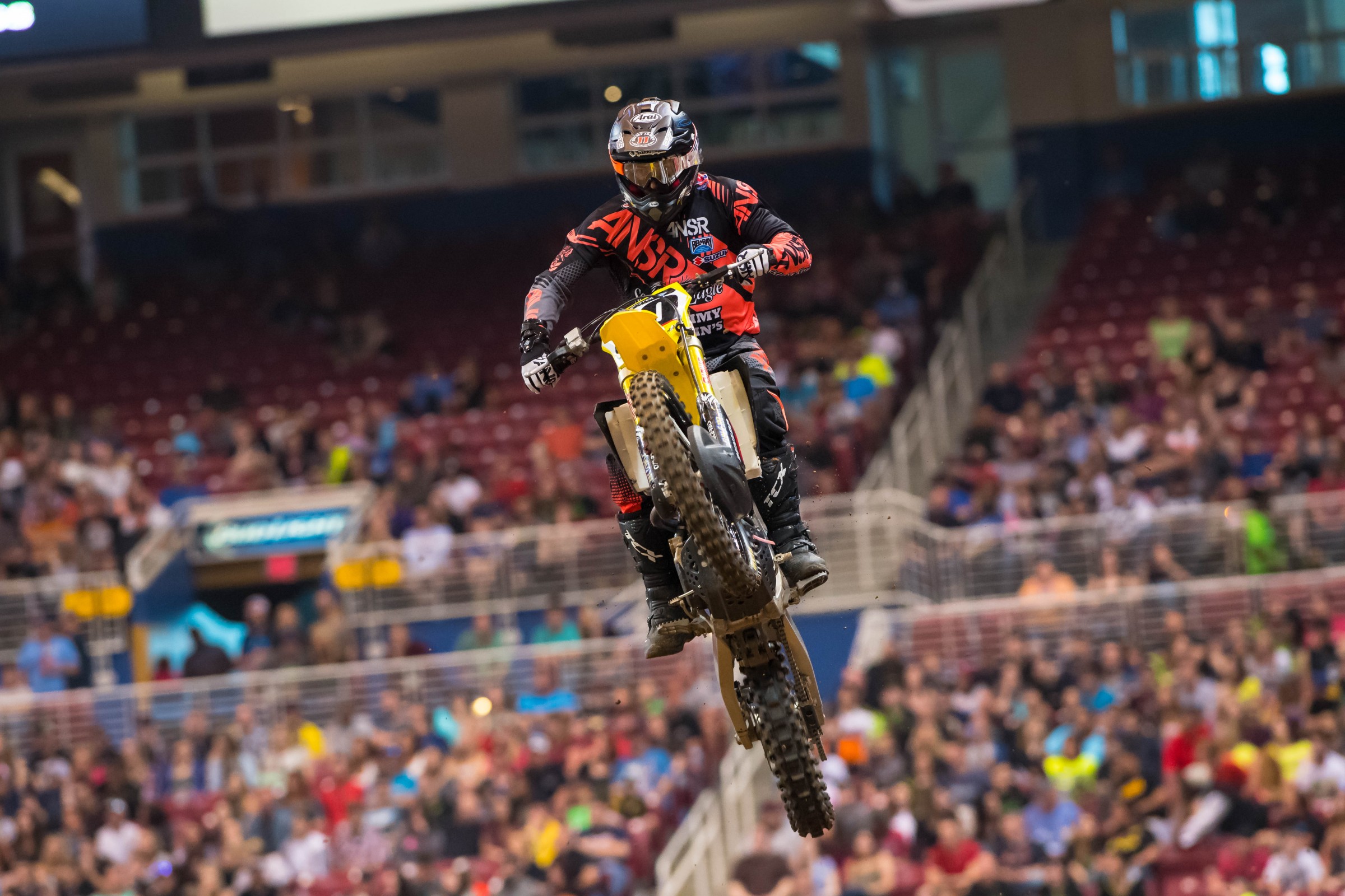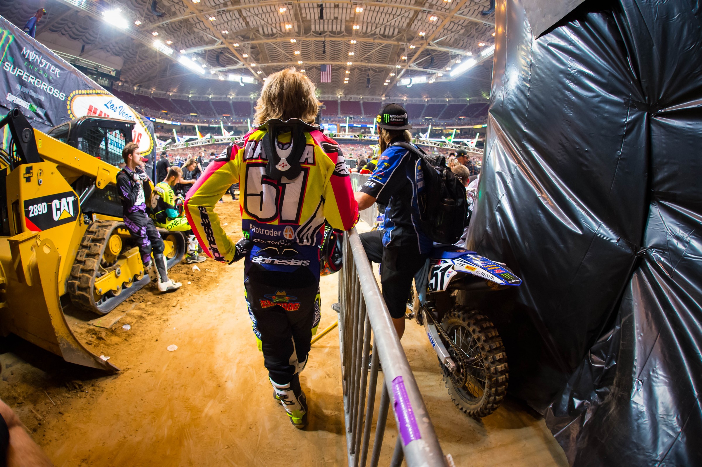 I’ve been back for three weeks now and this weekend was better than the last two. I’m building my confidence back up and getting the bike more comfortable. I’m not really sure where we ended up in the main, but I rode better than I have so I think if we keep building, every weekend I’ve been getting better, by the time it’s over I should be in the top five. It would be nice to mix it up a little with the front guys. It’s hard because at Anaheim I was fast and led a few laps and then I was injured. And now I’m struggling. But I’m getting better and better, and tonight was better. The team did a really good job with the bike.