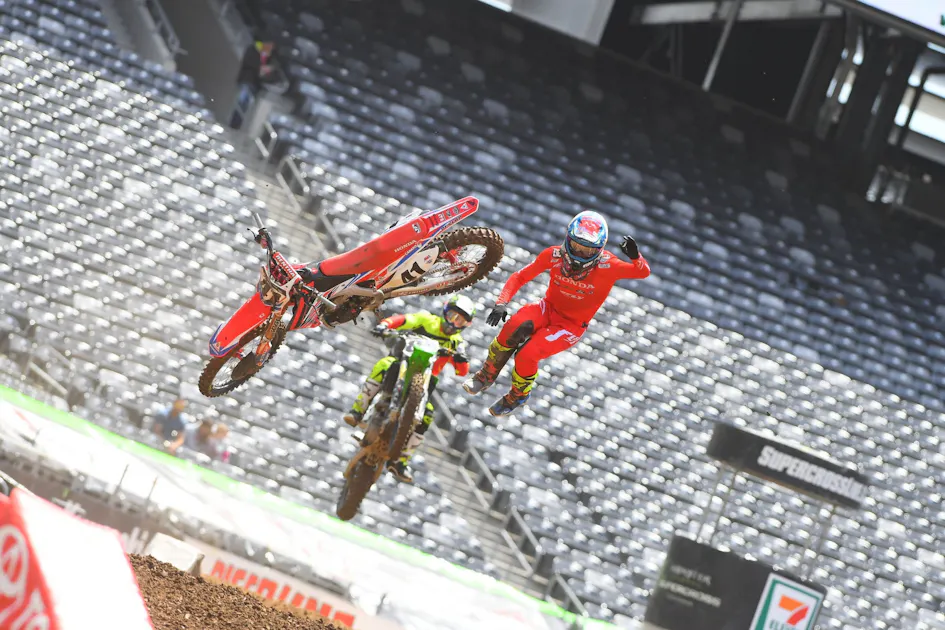 In the first 450 free practice today at East Rutherford, Honda HRC’s Trey Canard had a huge crash after appearing to clip a Tuff Block prior to the triple. He went flying off the bike and landed hard on the last jump.