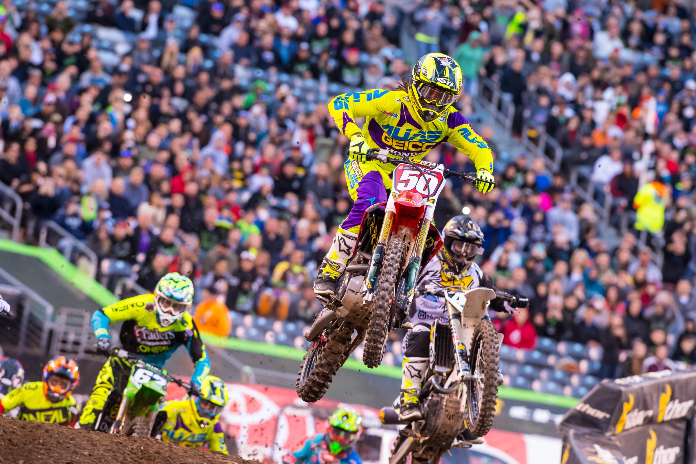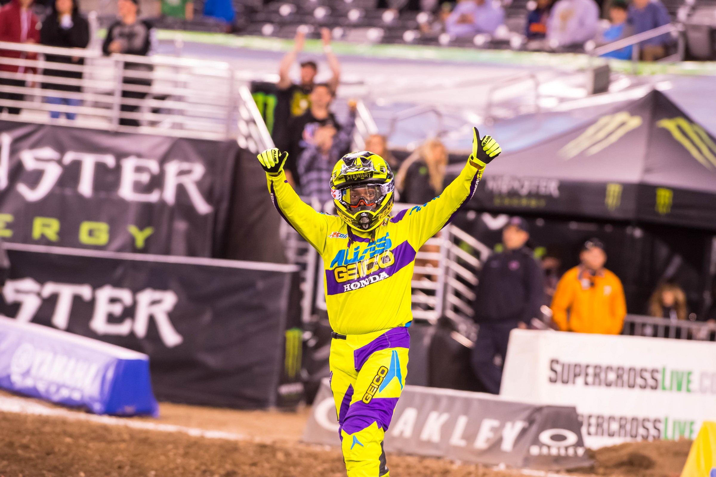 GEICO Honda’s Malcolm Stewart had a big sigh of relief—literally—after taking Saturday night’s 250SX East Region main event win. He’s bumped his points lead up to 14 with only the Las Vegas finale ahead—although the West Region riders will be in that one as well so it could get crazy. We found Malcolm down near the podium after the race.