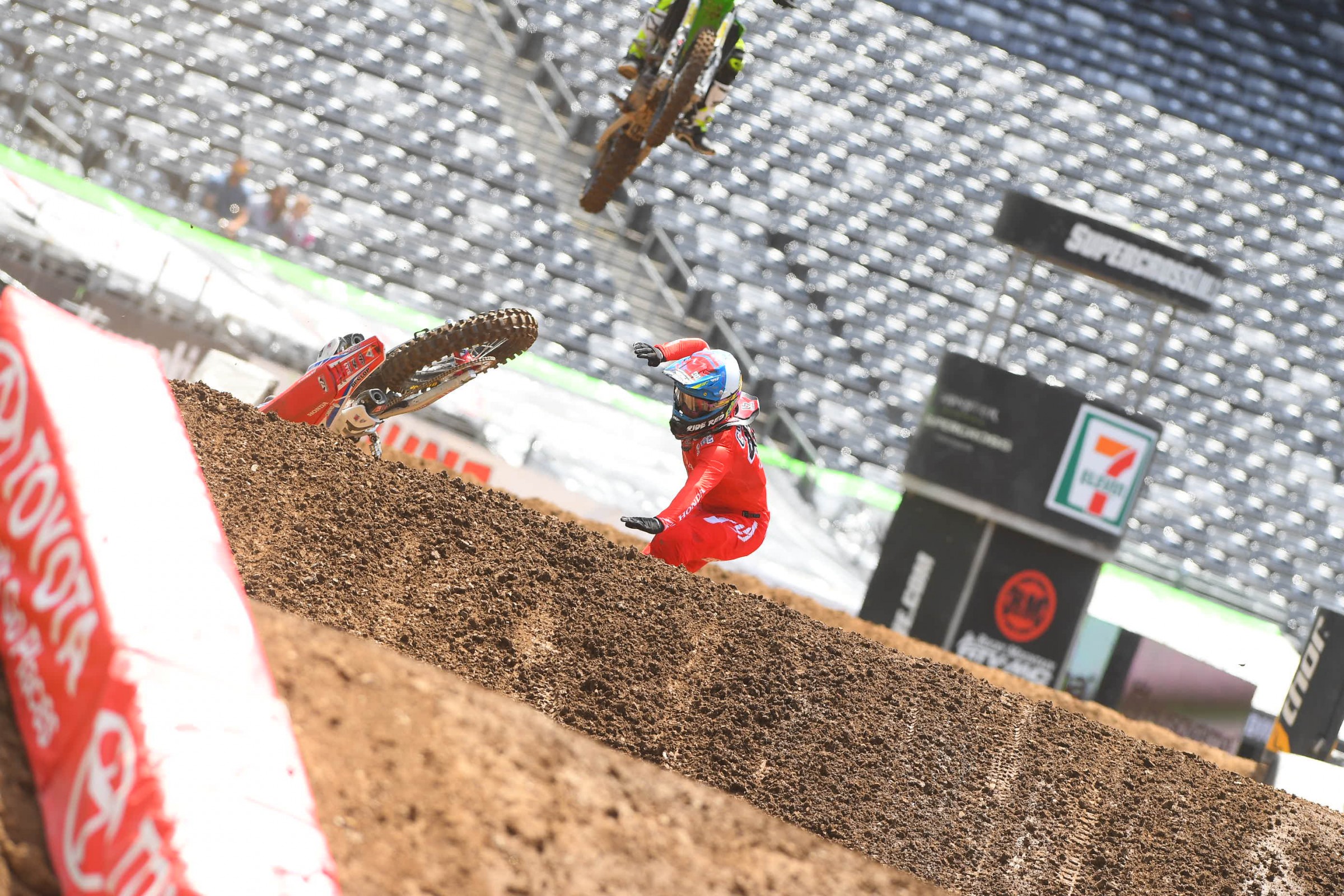 Visions of some of Trey Canard’s bigger, season-ending crashes rushed to mind as he flew through the air, sans his bike, over a triple, as he appeared to clip a Tuff Block in the first practice session. “I’ve had smaller crashes and not been able to walk away from them, so to have something that bad and basically come away unscathed is very lucky.” Canard said in a team statement.