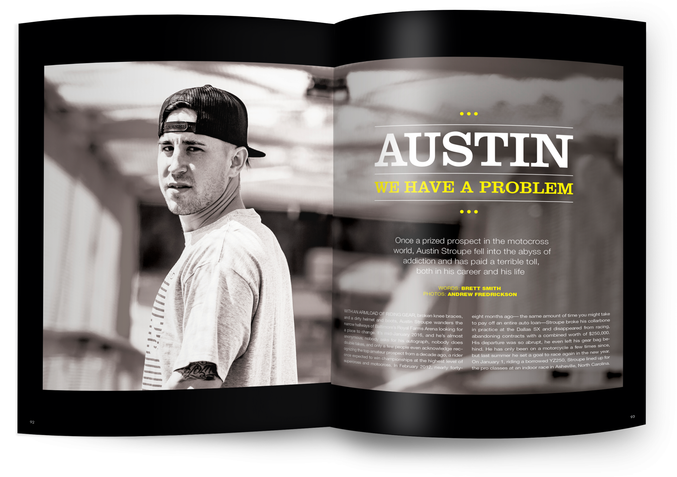 AUSTIN, WE HAVE A PROBLEM: Austin Stroupe, once one of the sport’s top prospects, comes clean about his struggles with addiction and his fight to get his life back. Page 92.