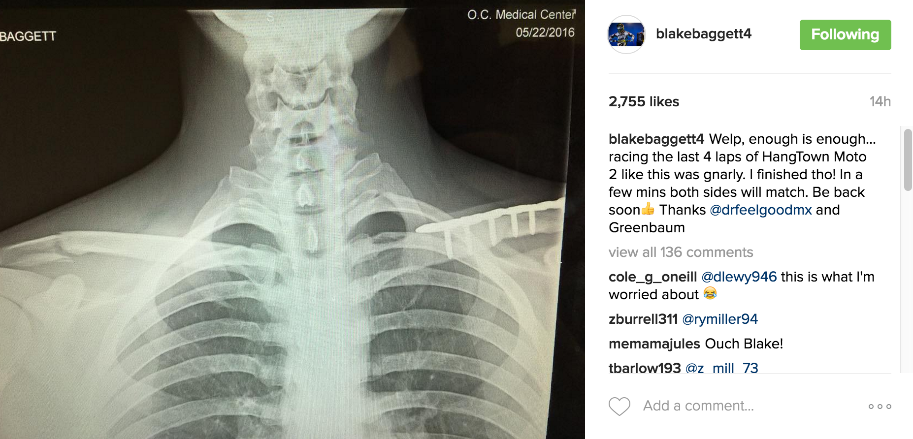 “Last four laps on that bad boy,” Blake texted along with this X-ray. He’s looking into getting it plated and returning to racing as quickly as possible.