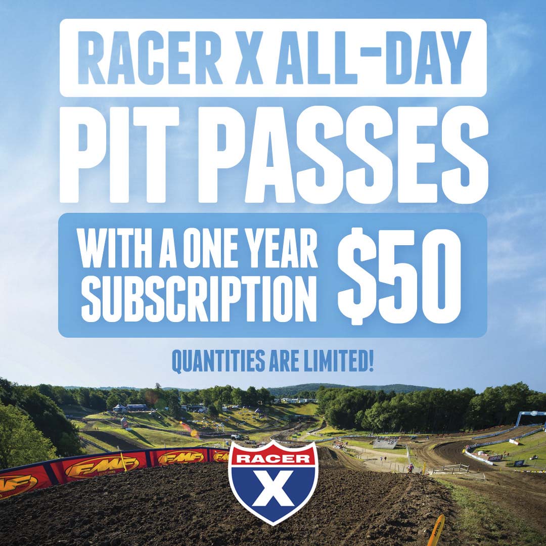 For $50, you get 13 issues of Racer X Illustrated plus an all-day pit pass. If you're buying more than one pass you can get a multi-year subscription, or you can give the subscription as a gift. This offer is good for both new and renewing subscribers.