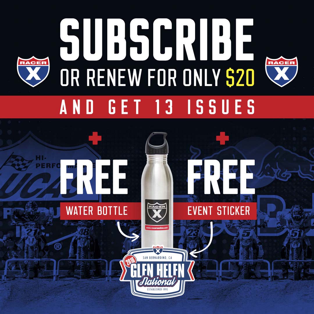 Stay hydrated this summer with a Racer X stainless steel water bottle. Just stop by the Racer X booth in Sponsor Village to subscribe or renew and get 13 issues of Racer X Illustrated plus a Racer X water bottle for just $20!