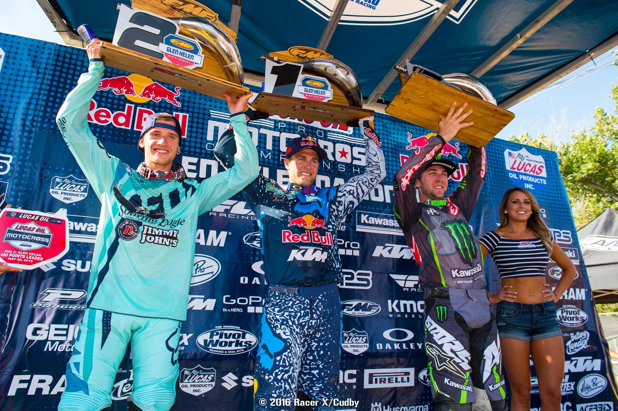 We knew the racing had the potential to get crazy today, and the first 450 moto delivered. Trey Canard got the holeshot but after a few turns Ryan Dungey moved into the lead as the two rocketed up one of Glen Helen’s big hills. Moments later Canard washed out and lost a bunch of time. Dungey started pulling a gap, and it looked like the crowd could be in for a boring moto. But Ken Roczen was able to get into second rather quickly and started reeling Dungey in. Just when it seemed there would be a major battle between the two Roczen made a mistake in a rhythm section, allowing Dungey to sprint back out. Roczen reloaded, caught him again, and made the pass. He then put down some ridiculously fast lap times, immediately gapping Dungey. At one point the gap was up to thirteen seconds! The race was all but over, but then a fitting on Roczen's air forks failed and his front suspension went away. As a result he couldn't jump anything sizable out there and had to scrub everything. Dungey caught back up with two laps remaining, made the pass, and disappeared with the win. Jason Anderson, who’d reeled in Eli Tomac for third, also caught Roczen. Tomac followed suit on the final lap.