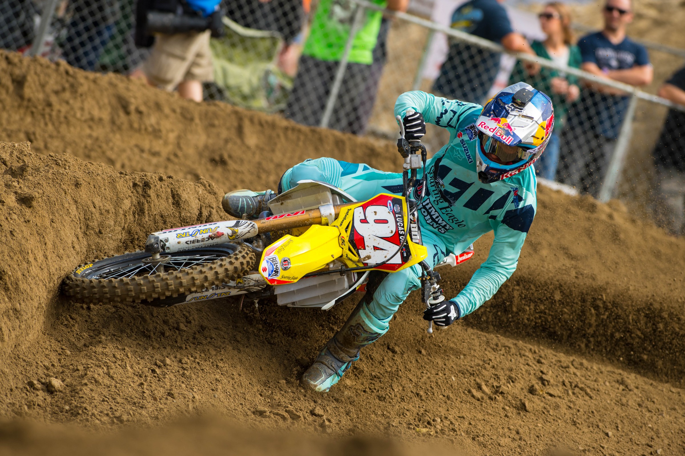 Soaring Eagle/Jimmy John’s/RCH Suzuki’s Ken Roczen is on fire. He had the speed to have swept all four 450MX motos in Lucas Oil Pro Motocross, but suffered a broken front fork while leading moto one at Glen Helen. He held on for fourth and came back to win moto two. That’s three of four moto wins this year and he still leads the points by two over Ryan Dungey.