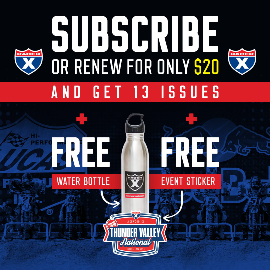 Stay hydrated this summer with a Racer X stainless steel water bottle. Just stop by the Racer X booth in Sponsor Village to subscribe or renew and get 13 issues of Racer X Illustrated plus a Racer X water bottle for just $20!