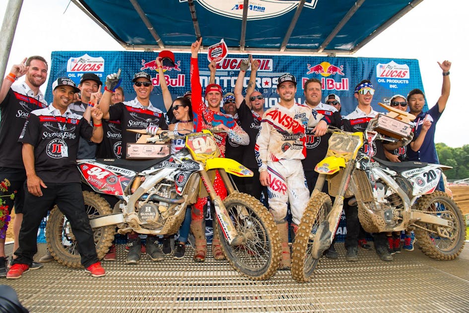 It’s easy to forget that Soaring Eagle/Jimmy John’s/RCH Suzuki’s Broc Tickle racked up four 450MX podiums during the 2012 season. But four years later Tickle is finally reaching that level again. For the second consecutive weekend, Tickle landed on the overall podium after holding a charging Justin Barcia off late in the second moto. In the first moto, Tickle opened some eyes by actually catching a Barcia/Tomac battle and putting pressure on them both for awhile, before taking fourth. He grabbed third in moto two, edging Barcia for a podium with a 4-3. Tickle pointed to his holeshot last weekend at Muddy Creek for his sudden turnaround.