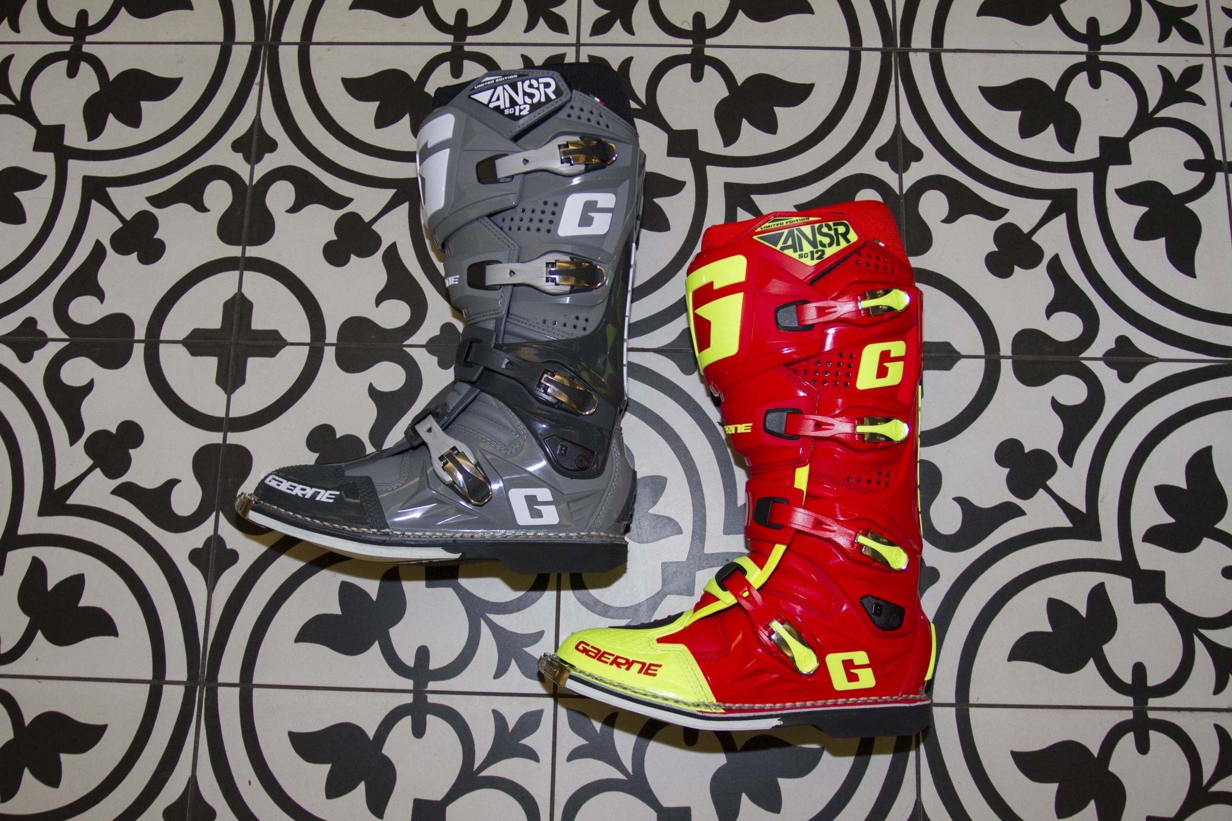 ANSR has partnered with Gaerne again with four color options: charcoal grey, red/hiVIZ yellow, orange/red, and blue/cyan. The AR-1 boot comes in black or white.