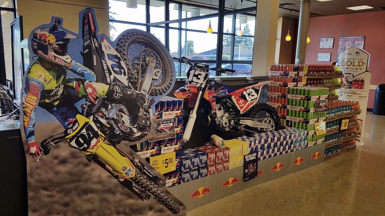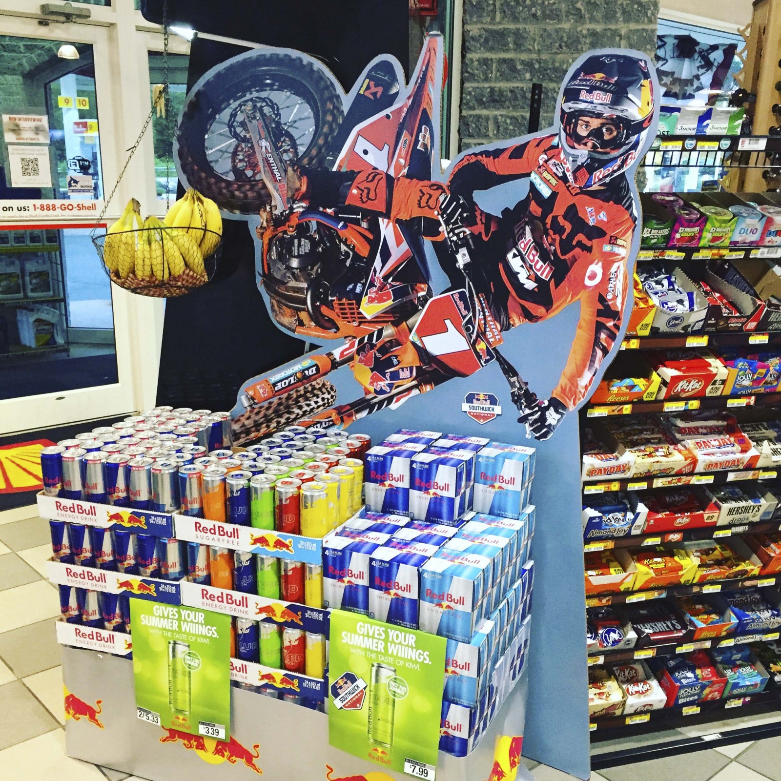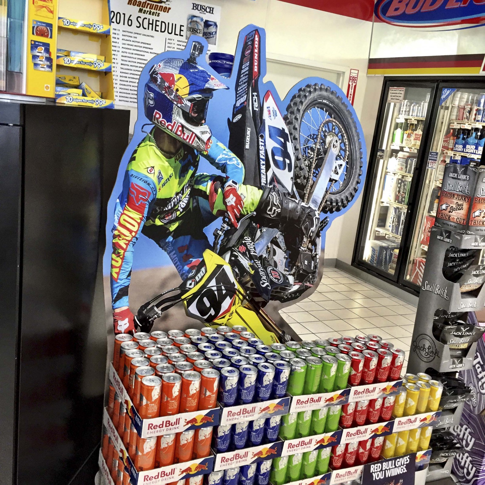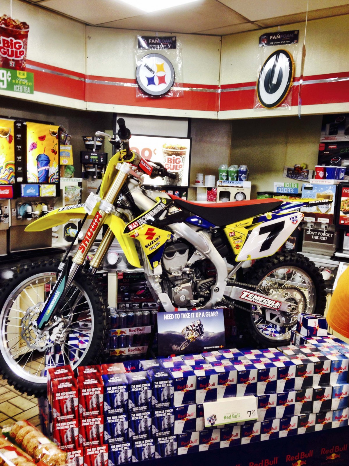 But we've found something much smaller than can have a bigger impact. Thanks mostly to the rise of energy drink sponsorships in the sport, we're noticing dirt bikes parked right in the center of local convenience stores, usually ones local to the races. Besides the in-store displays, there are often big posters and stickers right on the doors of the stores, which means anyone stopping to fill up with gas or get a cup of coffee suddenly knows the dirt bikes are in town. That's pretty cool.