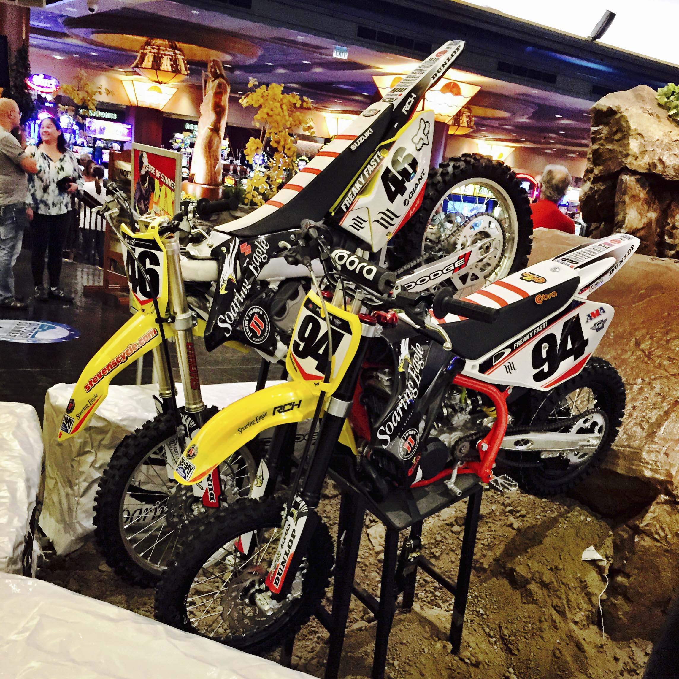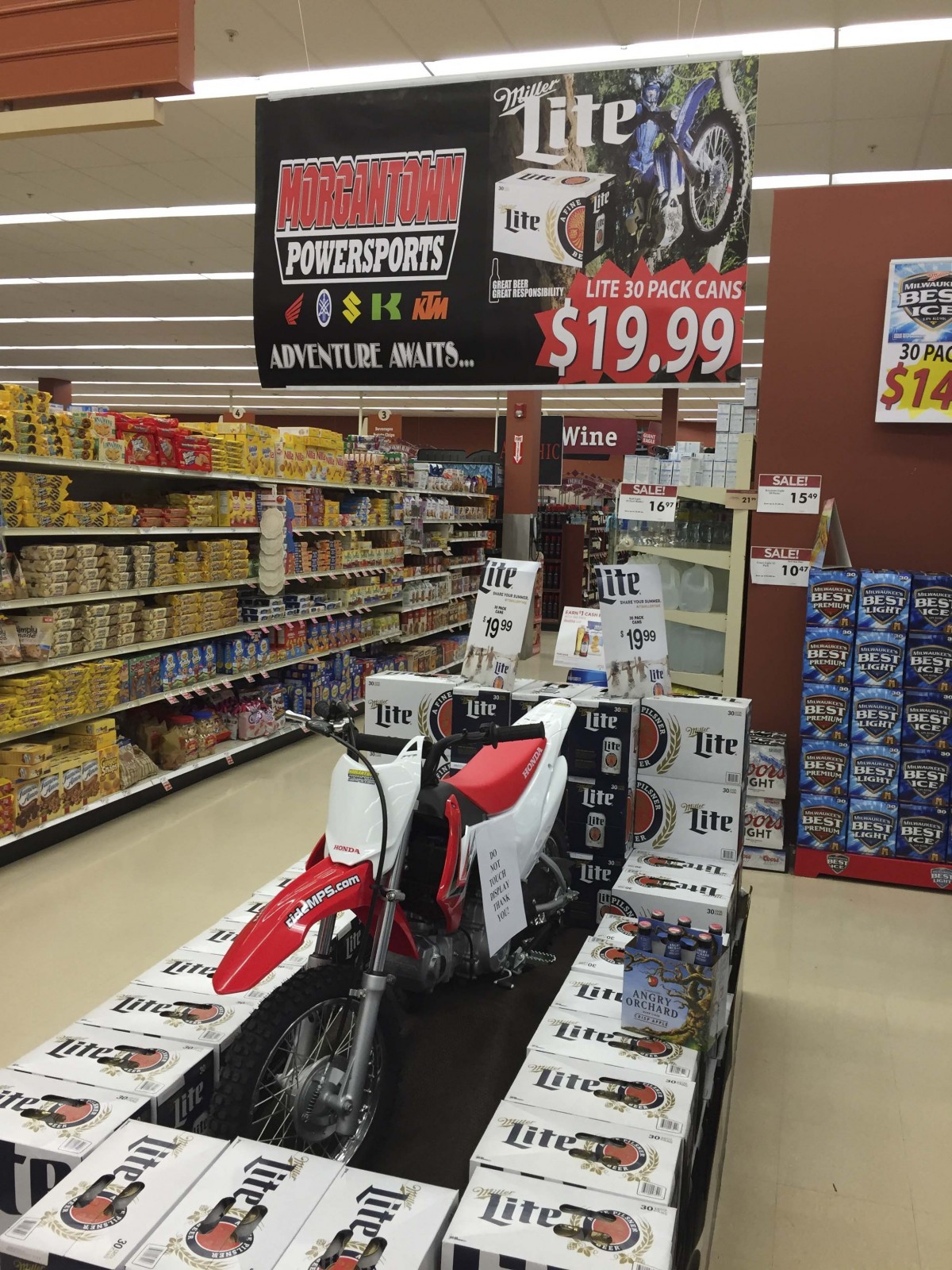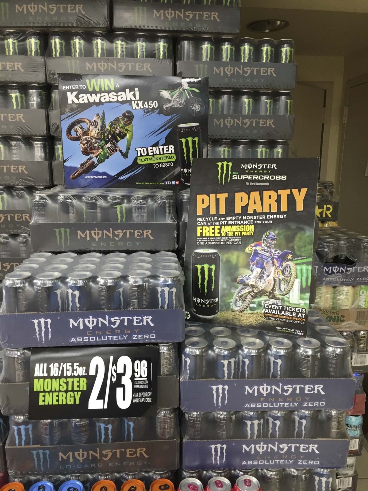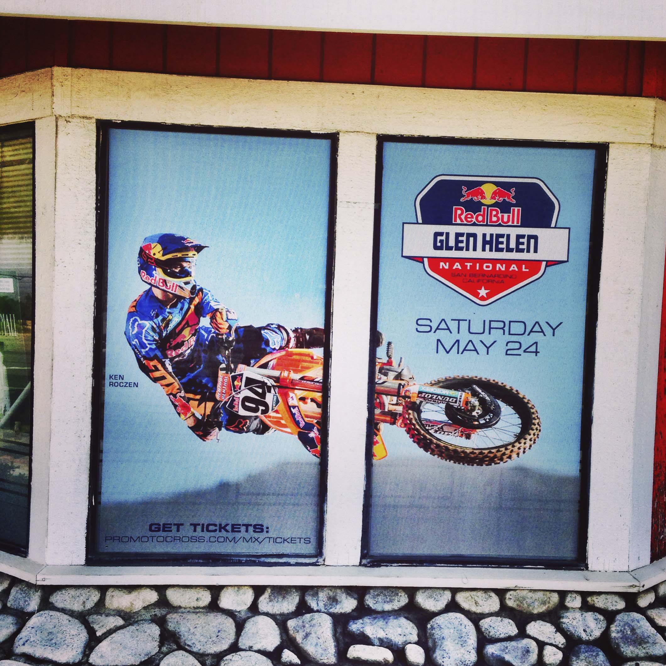 But we've found something much smaller than can have a bigger impact. Thanks mostly to the rise of energy drink sponsorships in the sport, we're noticing dirt bikes parked right in the center of local convenience stores, usually ones local to the races. Besides the in-store displays, there are often big posters and stickers right on the doors of the stores, which means anyone stopping to fill up with gas or get a cup of coffee suddenly knows the dirt bikes are in town. That's pretty cool.