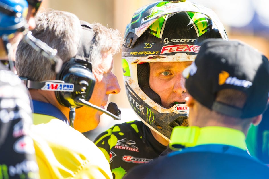Webb wears his emotions on his sleeve and is completely unopposed to retaliation or any other form of cat-and-mouse that is proposed. As Webb chased Savatgy down the hill and into the chicane, I didn’t think he would have a chance to make a move so quickly but a window opened. Savatgy chose the second rut in that first left hand turn and Webb dove to the inside. Webb made a picture-perfect move to the inside but then chose, completely based on an emotional response, to check up and force Savatgy to run into the back of him. For racers, this is known as a brake check. I have watched the replay at least 25 times and Cooper’s right foot is firmly planted on the rear brake just before Savatgy makes contact. The brake check move isn’t used very often and is typically one saved for valid reasons or pure anger. There is zero doubt that he was furious with Savatgy’s move and wanted payback. What he didn’t plan for was losing his balance, bouncing off of Jeremy Martin, and rocketing his bike out of the rut. Savatgy, on the other hand, ran into Webb when he stopped and stalled his bike in the process, nearly high-siding over him. Poor Jeremy Martin was just minding his own business, trying to go around the fracas and got run into and then run over. In one turn, the top three in points were all sprawled out, scrambling to remount while the pack was riding around them and their bikes.
