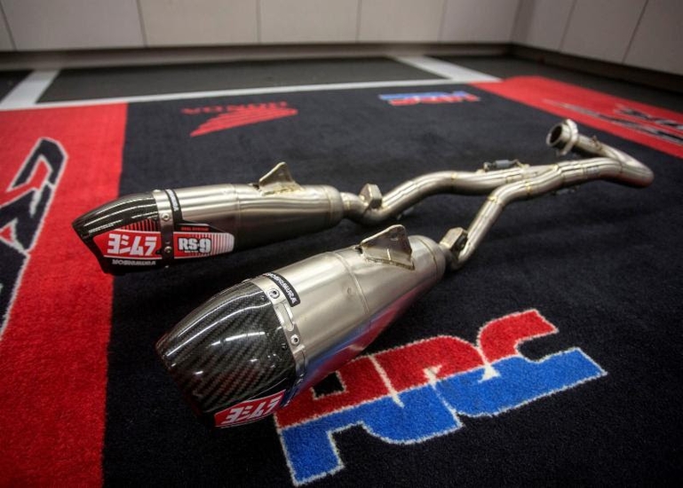 Yoshimura has been working tirelessly on development with American Honda HRC's engineers to achieve maximum performance and mass centralization, and to optimize rider usability. Yoshimura achieved all this while moving the rear muffler's all new RS-9T dual tapered shape forward to tuck in under the side number plates. Working with HRC race engineers and the all-new 449cc Unicam engine and its unique downdraft fuel injection system, Yoshimura engineers were able to deliver an exhaust that provides more trackable power and improved torque.