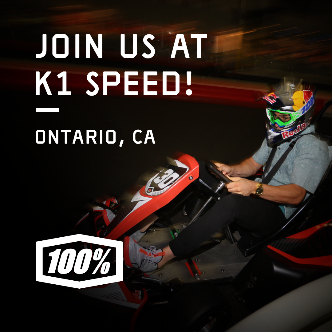 Ride with 100% athletes on Thursday, September 8 at K1 Speed in Ontario, CA, from 7:00pm - 9:00pm.