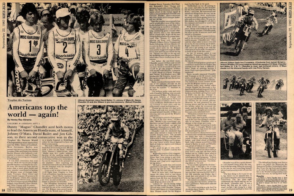 Our man Eric Johnson—who broke into this industry by writing for Cycle News, as did many of us—dug through his archives to find the opening page spread for each Team USA Motocross and Trophy des Nations victory from the early days. We'll post them all here.