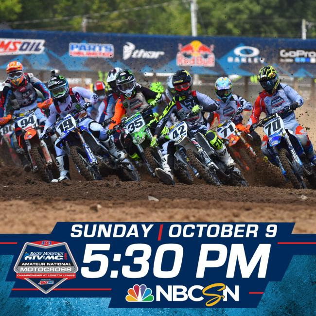 MORGANTOWN, W.Va - After a successful 35th annual event at the historic Loretta Lynn Ranch in Hurricane Mills, Tennessee, MX Sports is pleased to announce that NBC Sports Network (NBCSN) will broadcast two highlight shows featuring the 2016 Rocky Mountain ATV/MC AMA Amateur National Motocross Championship, presented by AMSOIL. Focusing on the event that took place August 1-6, race fans will be able to better understand the level of dedication and hard work that goes into competing at the pinnacle of amateur motocross.