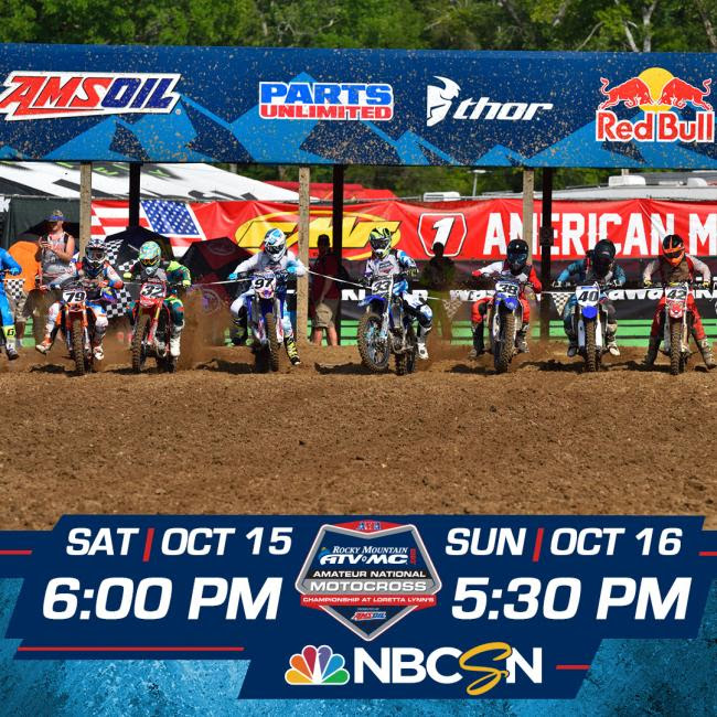 The first two highlight episodes from the 2016 Rocky Mountain ATV/MC AMA Amateur National Motocross Championship, presented by AMSOIL will premiere this Saturday, Oct. 15 6:00pm ET and Sunday, Oct. 16 5:30pm ET on NBCSN. We apologize for the time change from our original announcements, but due to Hurricane Matthew adjusting NASCAR TV times from Charlotte last weekend, the first episode got moved to this new Saturday time slot. The first episode will also re-air Tuesday, Oct. 18 at 4:30pm will more potential re-airs in coming weeks.