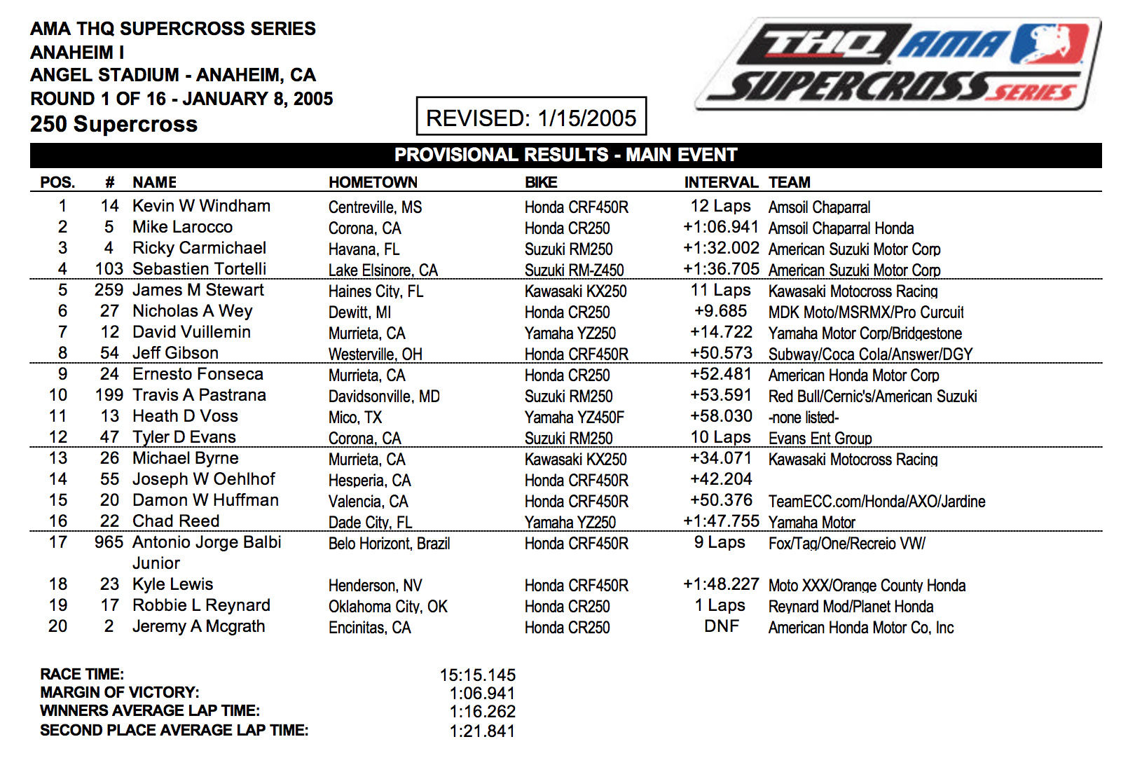 Anaheim 1, 2005, was an incredible event during an incredible time for this sport. It’s the most-hyped, most-anticipated season opener ever and if you don’t agree I might have to come through this computer screen. Here are the results: