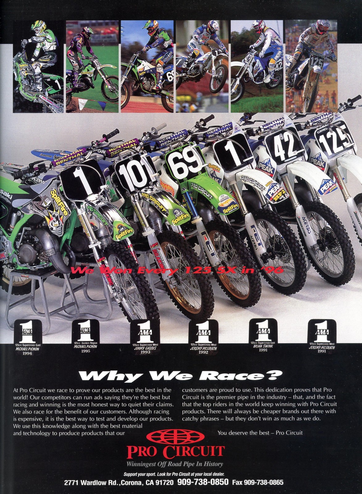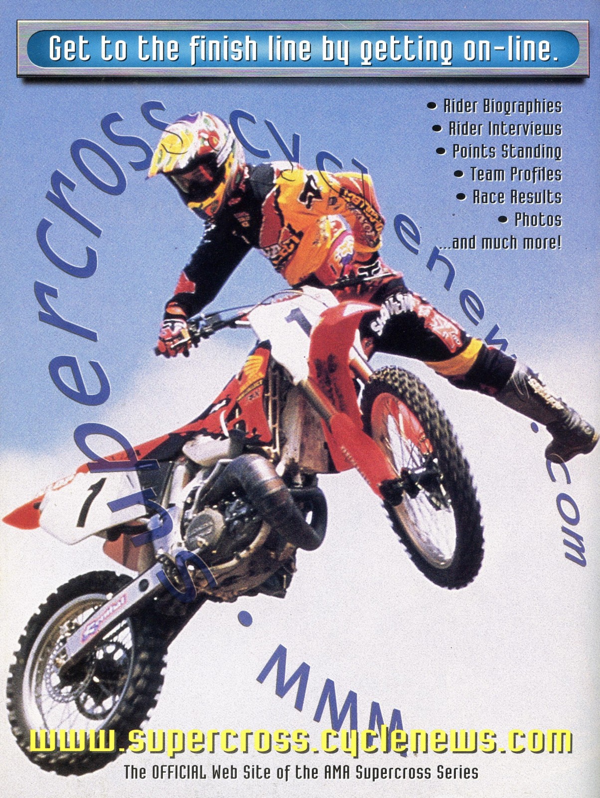 Digging a little deeper, there was a brief mention of #70 Ricky Carmichael from Havana, Florida, and his one professional career highlight: eighth place at the 1996 Steel City 125cc National. Teams were included like Honda of Troy, Chaparral Yamaha, Primal Impulse Honda, Xtreme/PJ1 Yamaha, Moto XXX, Sizzler/Noleen Yamaha, and more. And the Splitfire/Pro Circuit Kawasaki team’s ad page featured their growing collection of #1 plates, which totaled six to that point. There was also a feature on Mitch Payton’s new rival on the satellite team front, Phil “Flipper” Alderton of Honda of Troy, and ads for the latest in moto journalism, www.supercross.cyclenews.com, “the OFFICIAL Web site of the AMA Supercross Series,” pixelated image and all.
