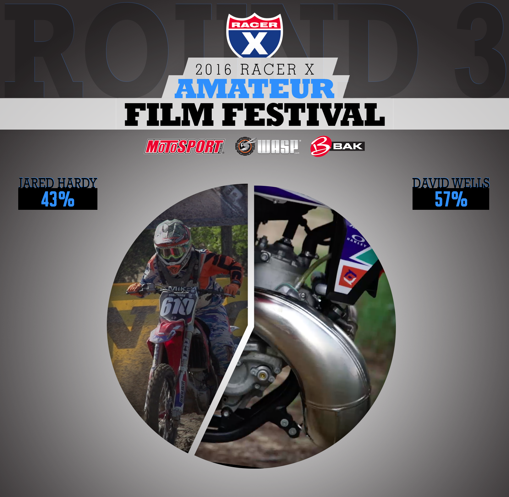 Congrats to Texas' David Wells for finishing over Colorado’s Jared Hardy in the third round of the Racer X Amateur Film Festival semifinals with 57 percent of the votes. Jared is our youngest semifinalist, at just 15 years old (that’s right, 15!), so you can expect to see his name in the future if he decides to stick with it.