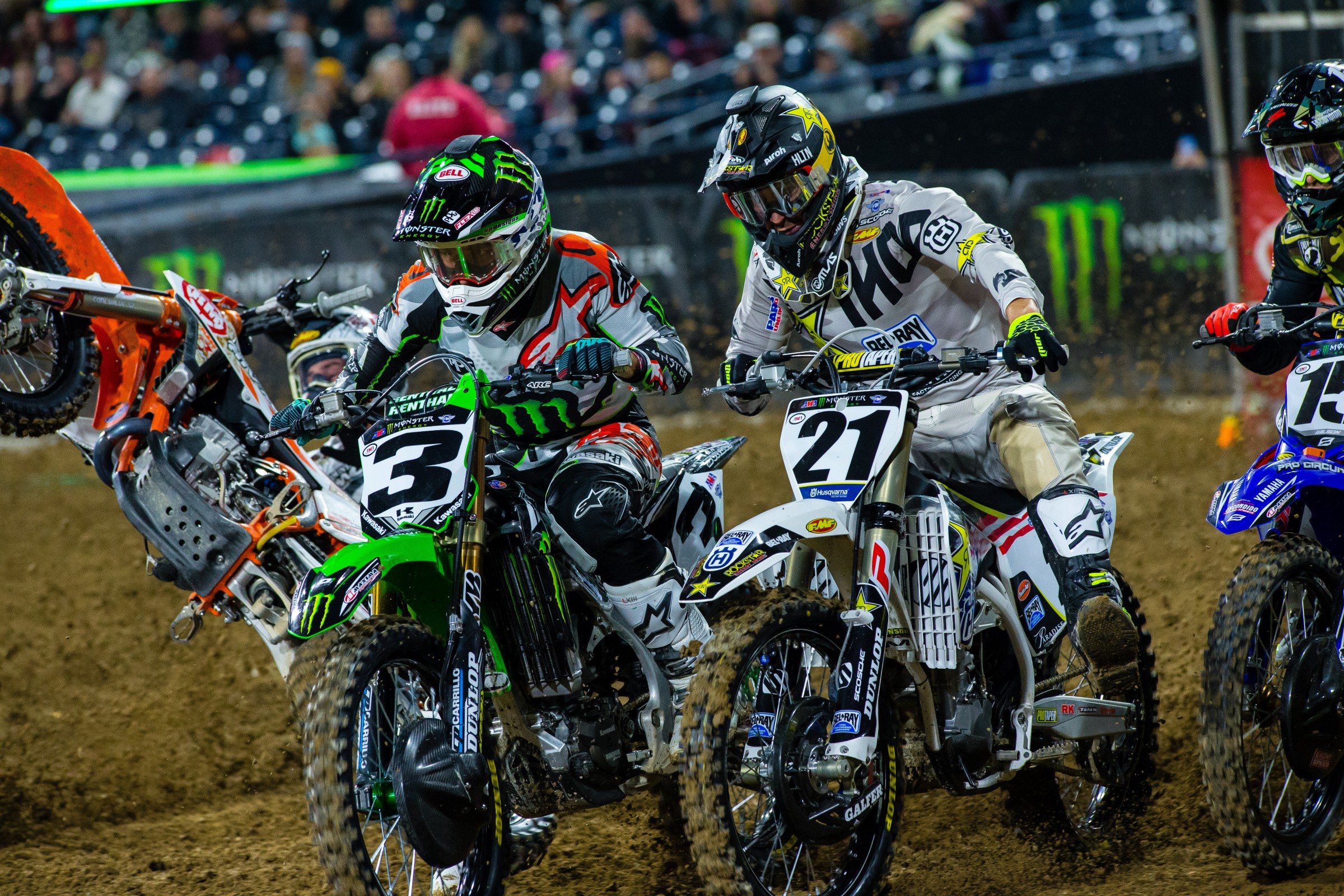 The 450SX main event was a twenty-four-lap duel between Ken Roczen and Ryan Dungey, offering all of the close, tense racing that last weekend’s race in Anaheim lacked. A week ago Roczen got the early lead and was gone instantly. This time Dungey started first on his Red Bull KTM and led for a few laps, then Roczen pulled off a quick block pass to steal the lead on his HRC Honda. The three-time and defending champ wasn’t going anywhere, though, and stayed within about a second of Roczen the entire way. On it went, minute after minute and lap after lap, the two pulling away from everyone else and keeping the crowd in anticipation the whole time. Dungey got really close as the white flag came out and had a few alternate lines and passing spots ready. He pulled alongside Roczen once, but Roczen held him at bay. Dungey had one last shot at the end of a long rhythm, but he needed to nail the whoops and a corner perfectly to set it up. But he bobbled in the corner, allowing Roczen to get away and hold it to the checkers. Two wins in a row for the German, but this one was totally different than the last.