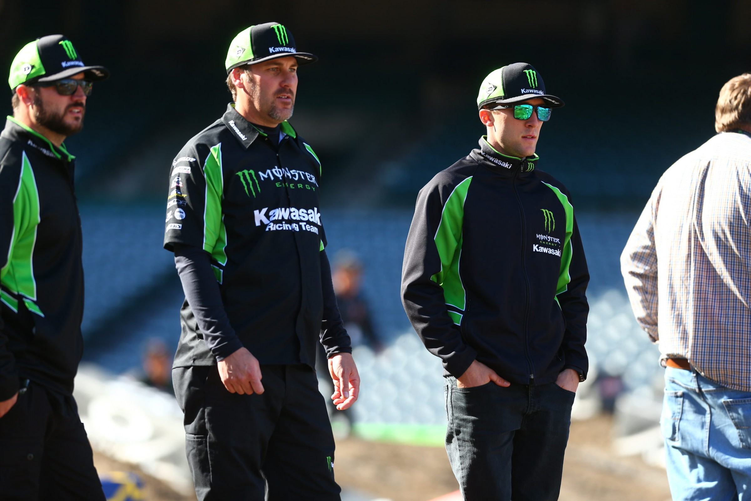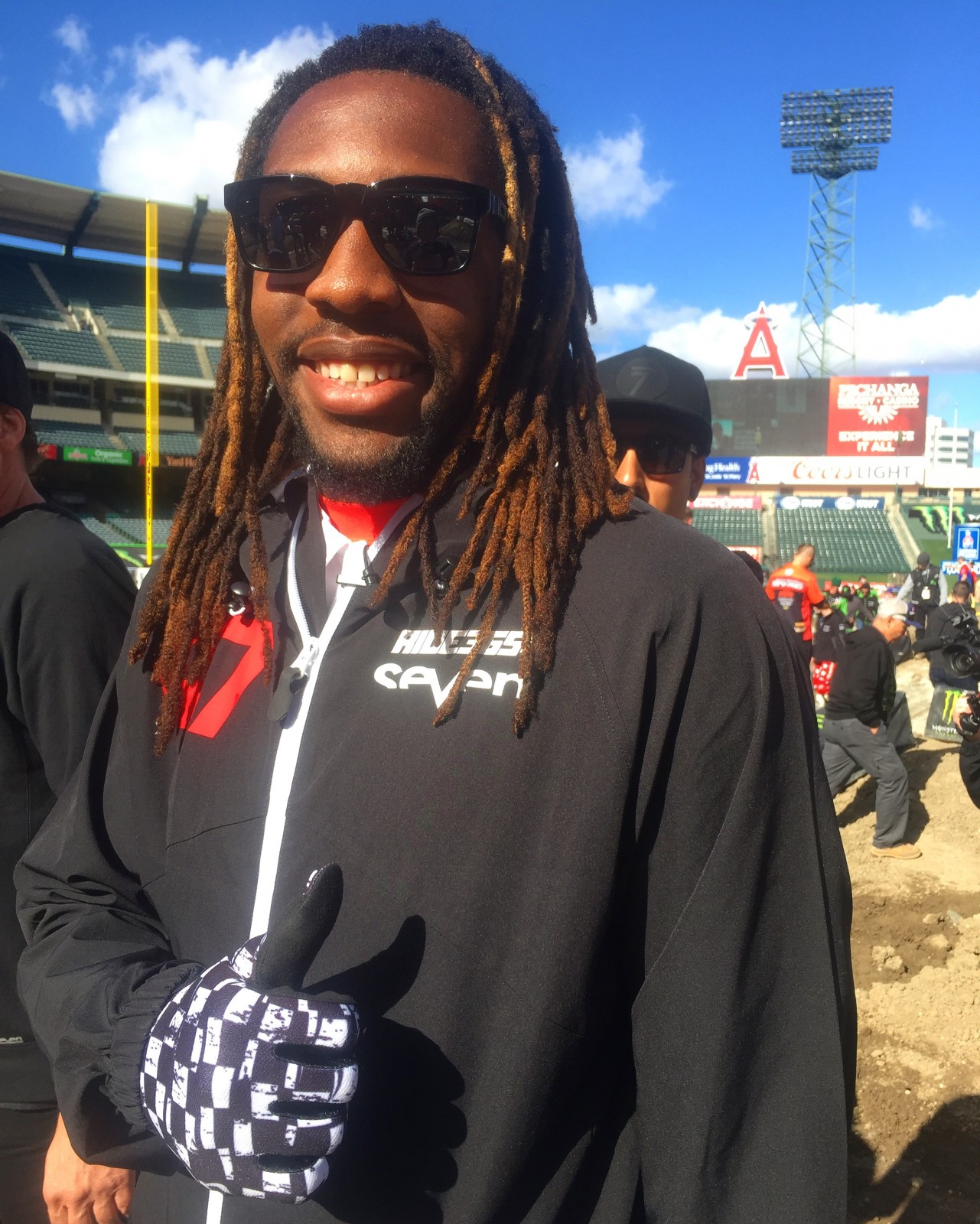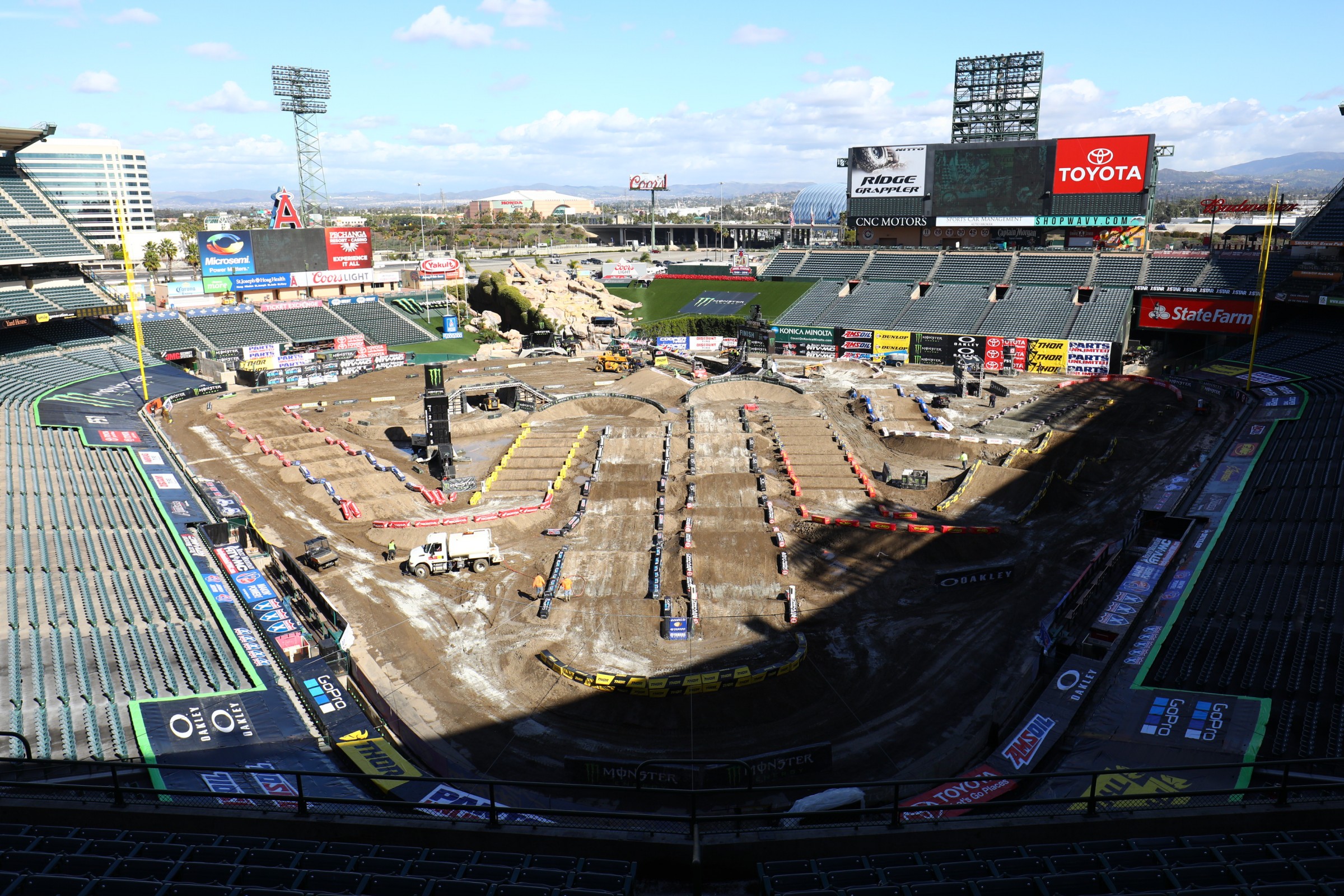 Another week of mud rumors, another track that isn't muddy. Monster Energy Supercross has rolled back into Angel Stadium for round three, and while California has been pounded by rain lately, Saturday has dawned sunny and breezy. The track was built Wednesday and covered before the rain came in, now the tarps are pulled, some "drying agent" has been added, and things look good.