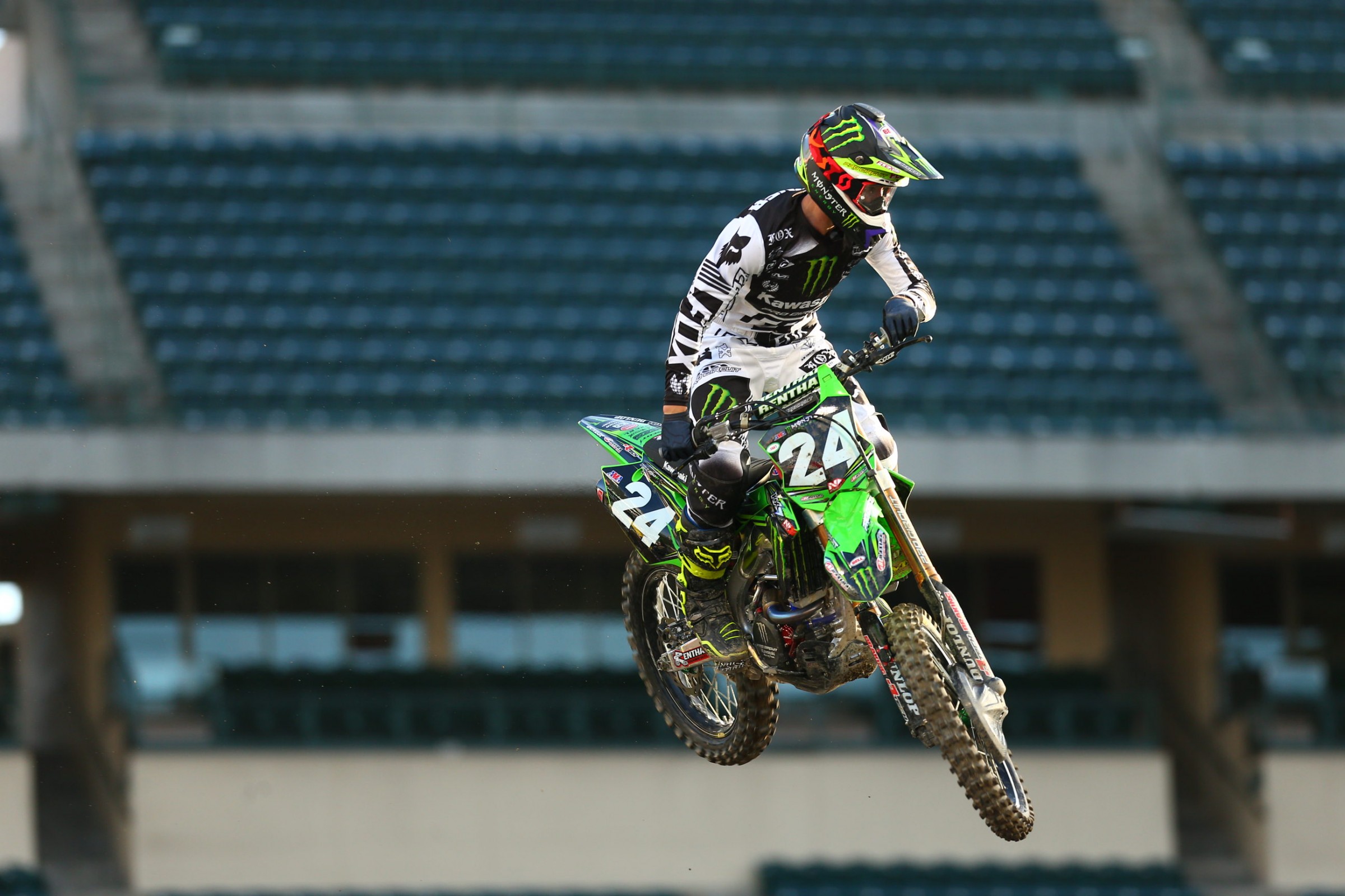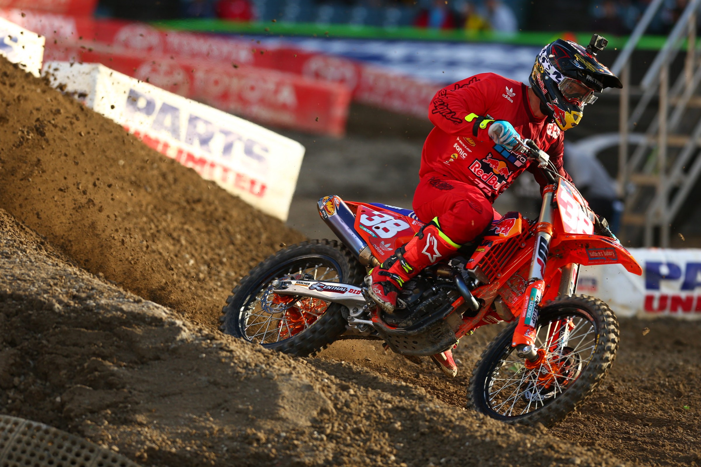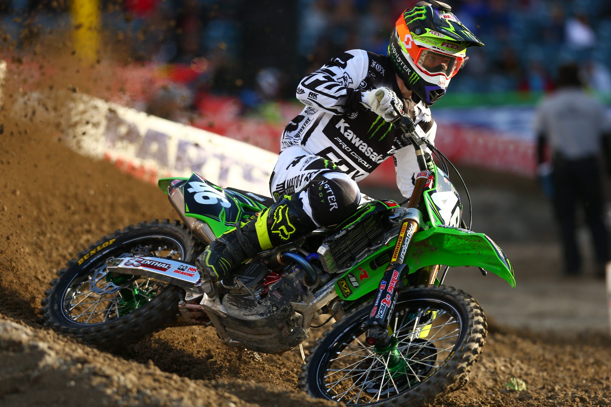 It looked like Roczen cross rutted on the face of the triple of the rhythm before the bike was ripped out from under him. Similar to his crash at Monster Cup, he ejected from the bike. The difference between his Monster Cup crash and tonight's crash was this time he went into head first instead of feet first and slammed into the face of the next jump with a halt, instead of smoothly sliding down the landing like he did in October. The crash was so violent the visor on his helmet exploded off. The entire stadium went nuts and Roczen laid there for several laps not moving. The Alpinestars medical unit eventually got Roczen to his feet and moved him slowly, one step at a time, with support to the cart. He left the track sitting up in the cart, with his helmet still on, and a splint on his left arm. He has been taken to a local hospital for further evaluation. Honda later released a report saying Roczen has broken his left forearm.