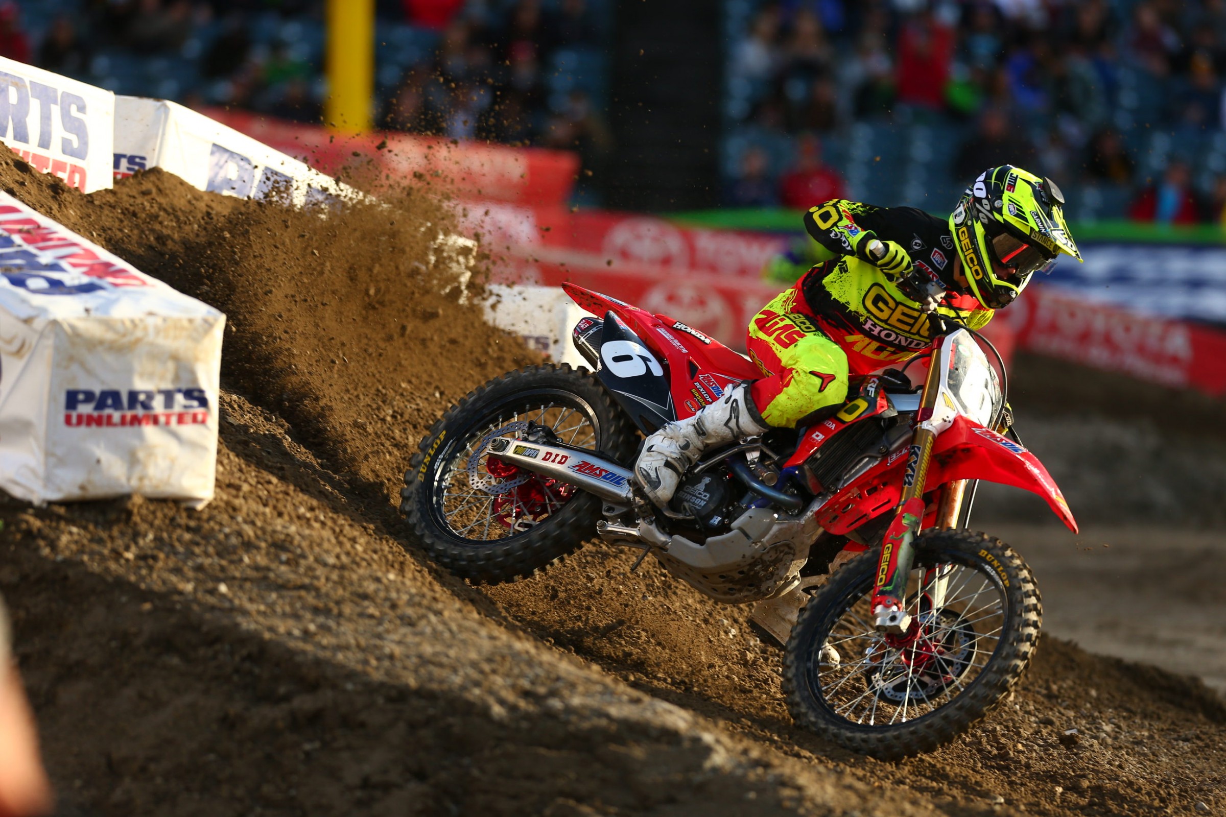 Due to the moisture this week, the first untimed practice was canceled just like the last time we were in Anaheim this year. Some deeper ruts than were used to seeing at Angel Stadium are forming, especially on the face of the over/under jump. There’s a really interesting 270 degree left turn after the over/under that should be a good place for passing. The over/under jump requires some real finesse due to the face and landing being so steep and the corner being directly after the landing. The landing on the lone triple is pretty small and in every session everyone was over jumping it and landing to flat. Disclaimer: stiff suspension required. There is also a step-on-step-off before the finish that looks very 1997 with it being the only section in the lane. Thanks to four-strokes, 2017 step-on-step-offs a little different in the fact that the middle section is much shorter so they have less real estate to gain speed and there is no lip to help you clear the landing of the step off. With the lack of lip on the step off, many riders are clipping the landing with their back wheel and nearly nose-wheeling into the corner, but luckily there’s enough space to the corner that they can get the rear back down in to go left and not up and over.