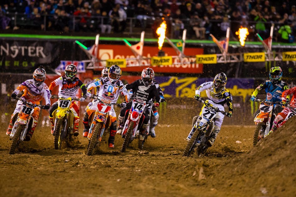This is how you do it, folks. Cooper is railing a deep rut that looks to be just after the whoops. His foot is lifted high and out of the way. He has slid forward to gain more control over the front end of the bike. He is feeding his clutch through the turn to control RPM and acceleration. One could argue that maybe he could lean more with his head to the inside of the turn, but it’s difficult to say without seeing the curve of the rut. If it has a hook, he may have had to sit up and then lean over at the apex. Ruts cut into super tight supercross corners are never perfect arcs. Also, this is just one snapshot of things happening very quickly. His lean angle will change a couple of times throughout a rut this long.