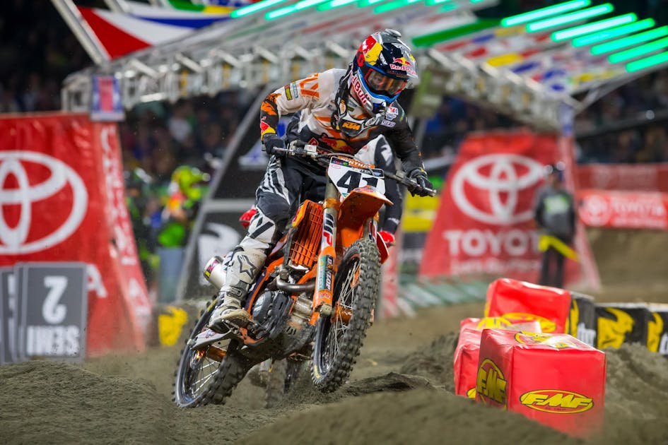 Well, you know what happened: Eli Tomac came from maybe 10-seconds back to track Dungey down and passed the #1 orange bike to take consecutive 450SX wins for the first time in his career. Dungey didn’t seem too fazed—the Oakland track was technical, tough, and very tricky—and his points lead actually grew from 15 (over teammate Marvin Musquin) to 17 (over new runner-up in the rankings Tomac) as the series made the turn east to Dallas this weekend.