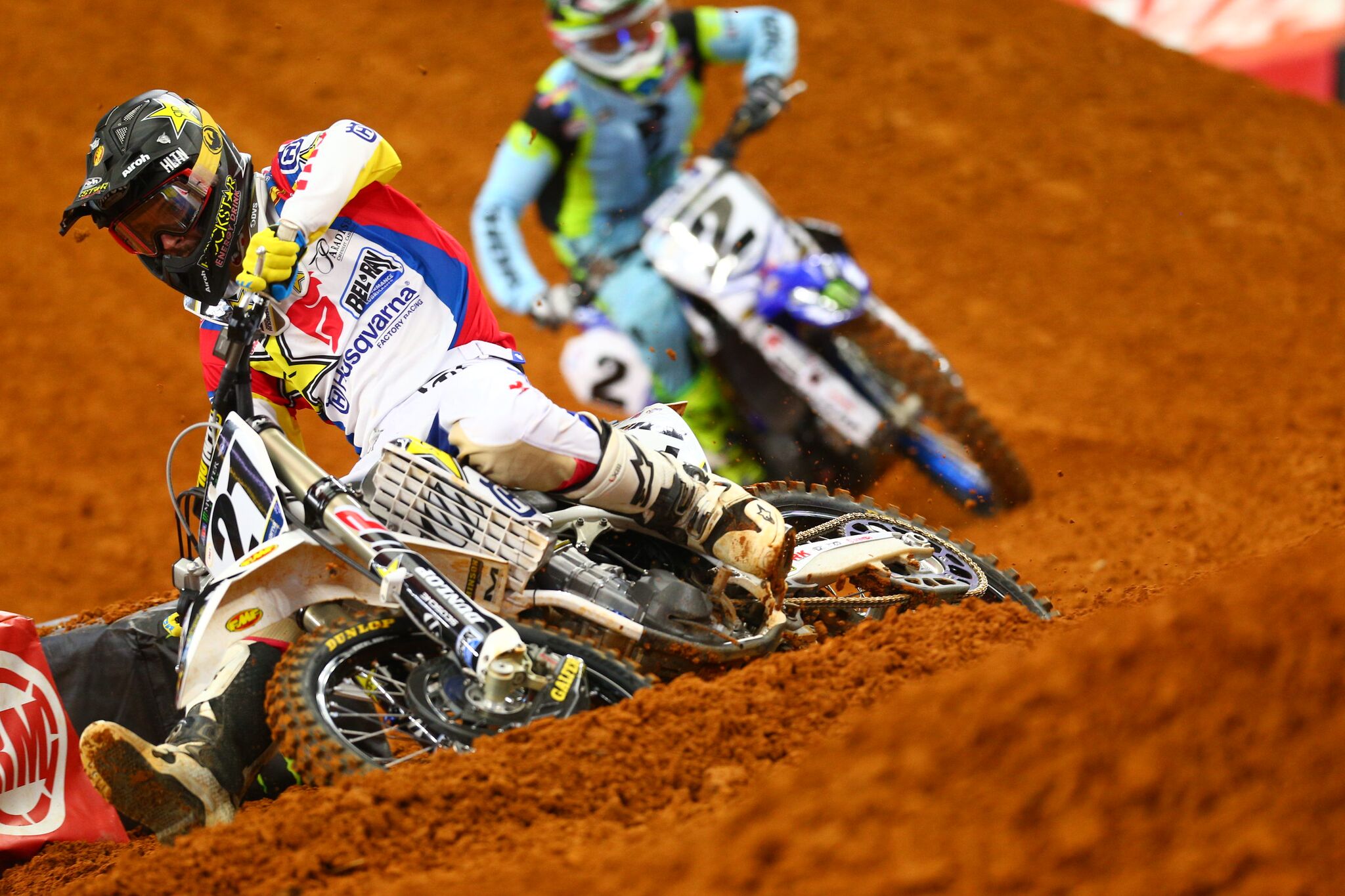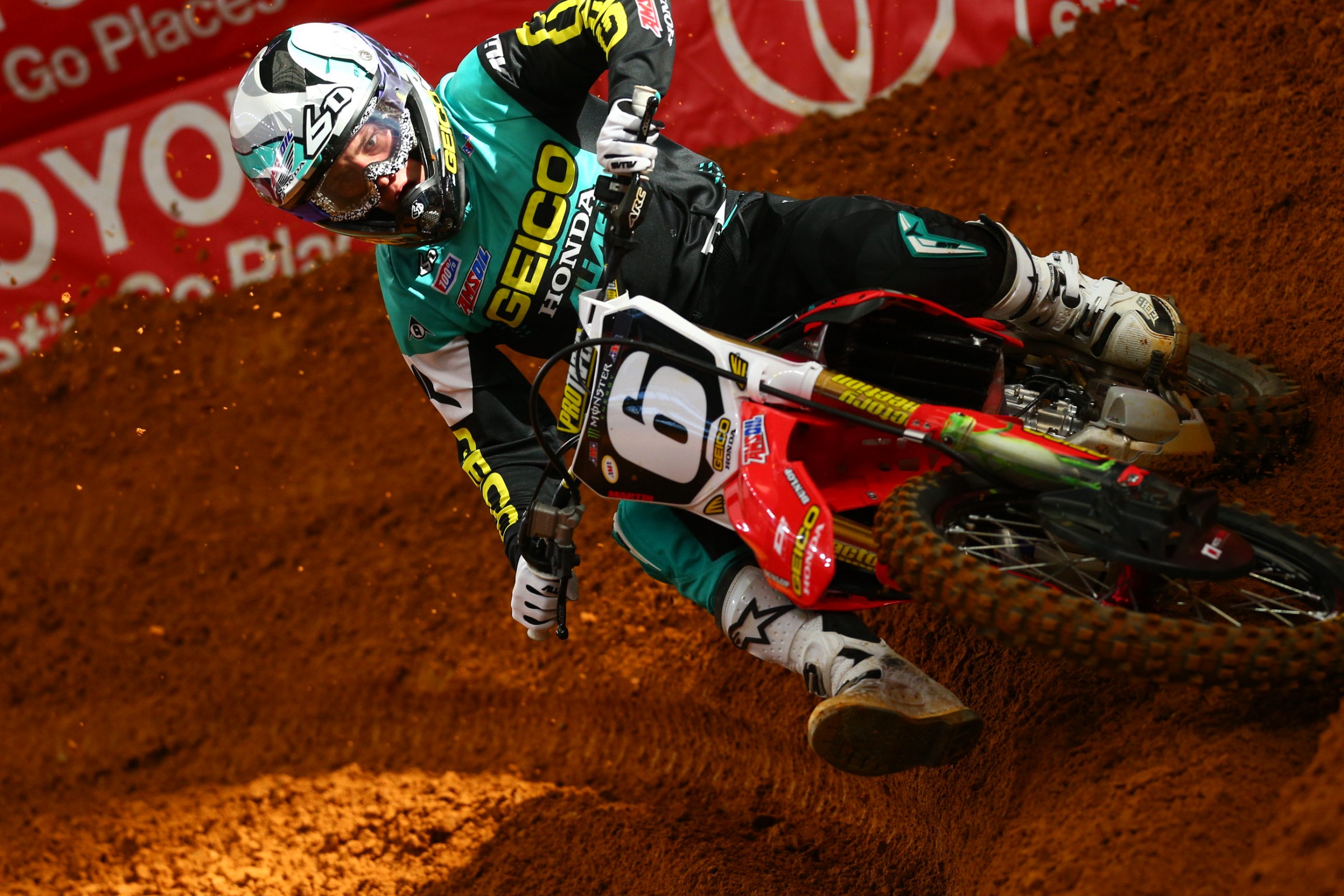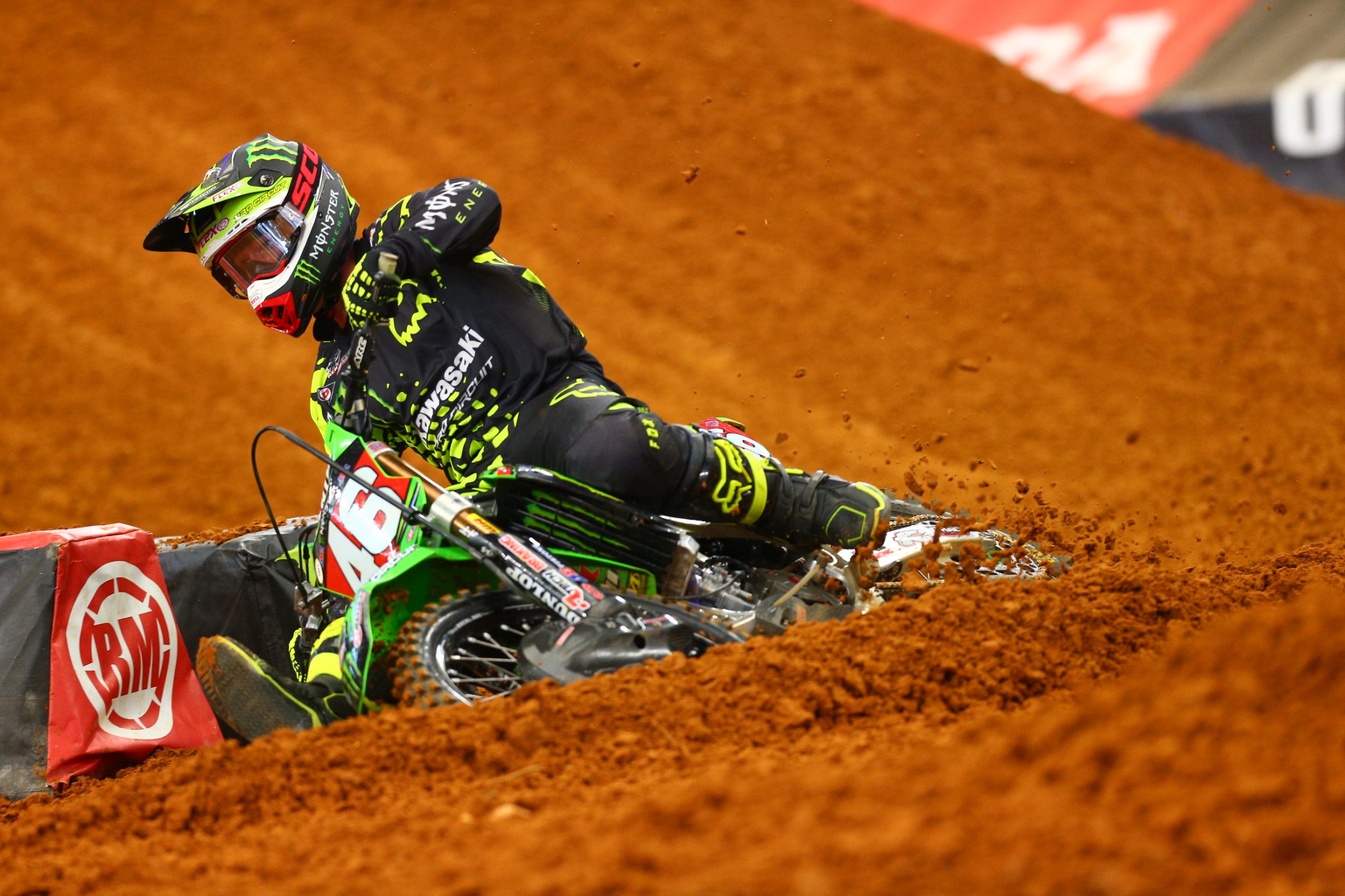 This was a stacked heat race with lots of action everywhere. On the first lap, Eli Tomac doubled the triple and then singled the third. Tomac jumped into the inside of the corner and came down onto the back of Cooper Webb’s bike and went down. Near the end of the race Jason Anderson was close behind Malcolm Stewart when Stewart had a bizarre solo crash. Stewart caught his front wheel going into the corner and as he made the 180 degree turn he went over the bars. While this was all happening Anderson was right there, got pushed off balance, and whisky throttled his bike over the top of the berm. His bike looped out and almost launched into the next rhythm lane. Trey Canard made his return to racing this weekend and was charging through the pack. Canard was about to make a move on Millsaps for third when Webb made a move on him in the same way Musquin got Baggett in the first heat. Webb squared up the corner after the straight and launched by Canard to take the final transfer spot.