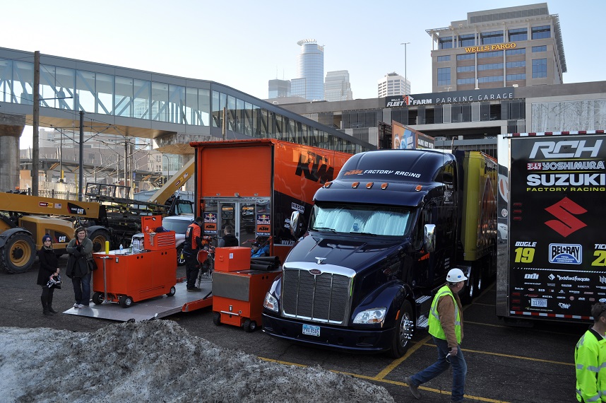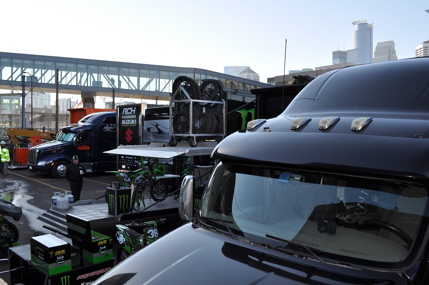 As much room as there is on the inside of the stadium, there's very little space outside, which forced race organizers to forego the usual pit party. There’s barely even room for the teams to unload and prep bikes! Don’t worry though, there will still be plenty of action inside the stadium when qualifying gets underway at noon.