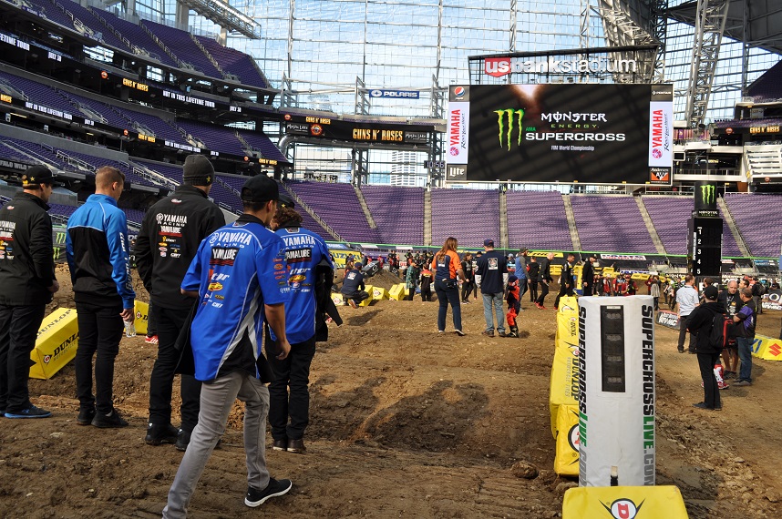 At first glance today’s track looked like it might provide slightly longer-than-average lap times, but when the bikes hit the dirt that theory went straight out US Bank Stadium’s gigantic windows. So far lap times have been right around the 50-second mark, with the fastest guys dropping into the 48-second range . And speaking of fastest guys, Adam Cianciarulo and Christian Craig came out of the gate hard in the first qualifier, dominating the board and trading fast laps for the first half of the session. But then a few guys started closing the gap and Cianciarulo’s time eventually dropped to fifth behind Joey Savatgy in fourth. Craig dropped a couple spots too when both Zach Osborne and Dylan Ferrandis busted out a couple scorchers at the end. If you’re not sure who Dylan Ferrandis is, you will soon. He’s a European rider who signed with Yamalube Star Racing Yamaha and he looked pretty good out there.