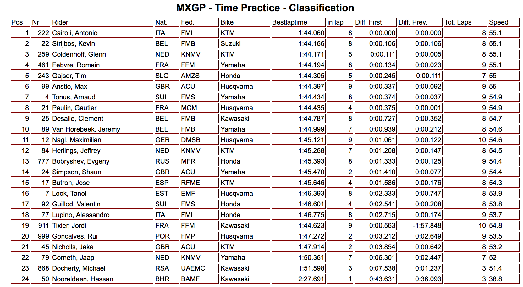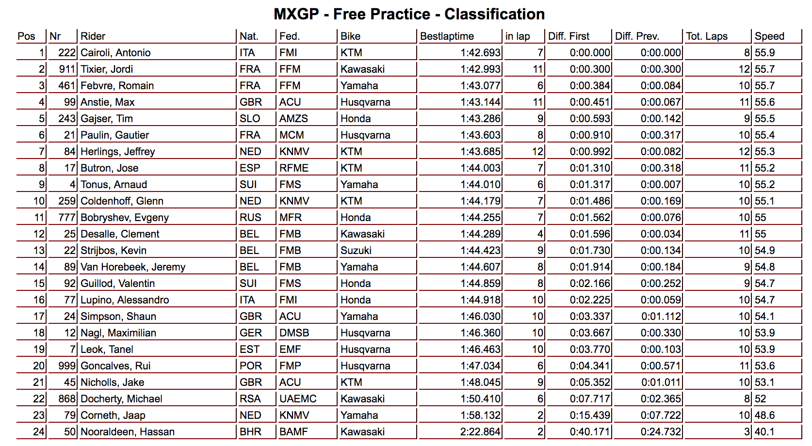 Cairoli, who enters the season after winning the Italian Motocross Championship, bested Monster Energy Kawasaki’s Jordi Tixier. Cairoli (1:42.693) and Tixier (1:42.993) were the only two riders to set laps in the 1:42 range.