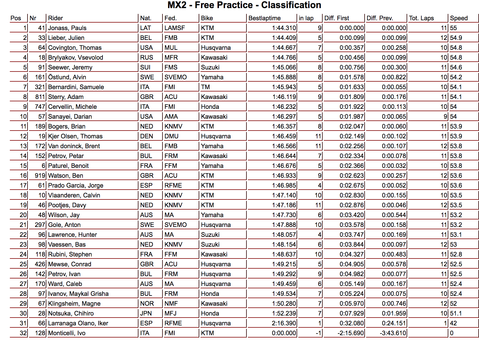 Red Bull KTM’s Pauls Jonass set the quickest time in MX2, with a 1:44.310, just edging out the privateer Julien Lieber (1:44.409), who is competing for the first time in 17 months due to injury.