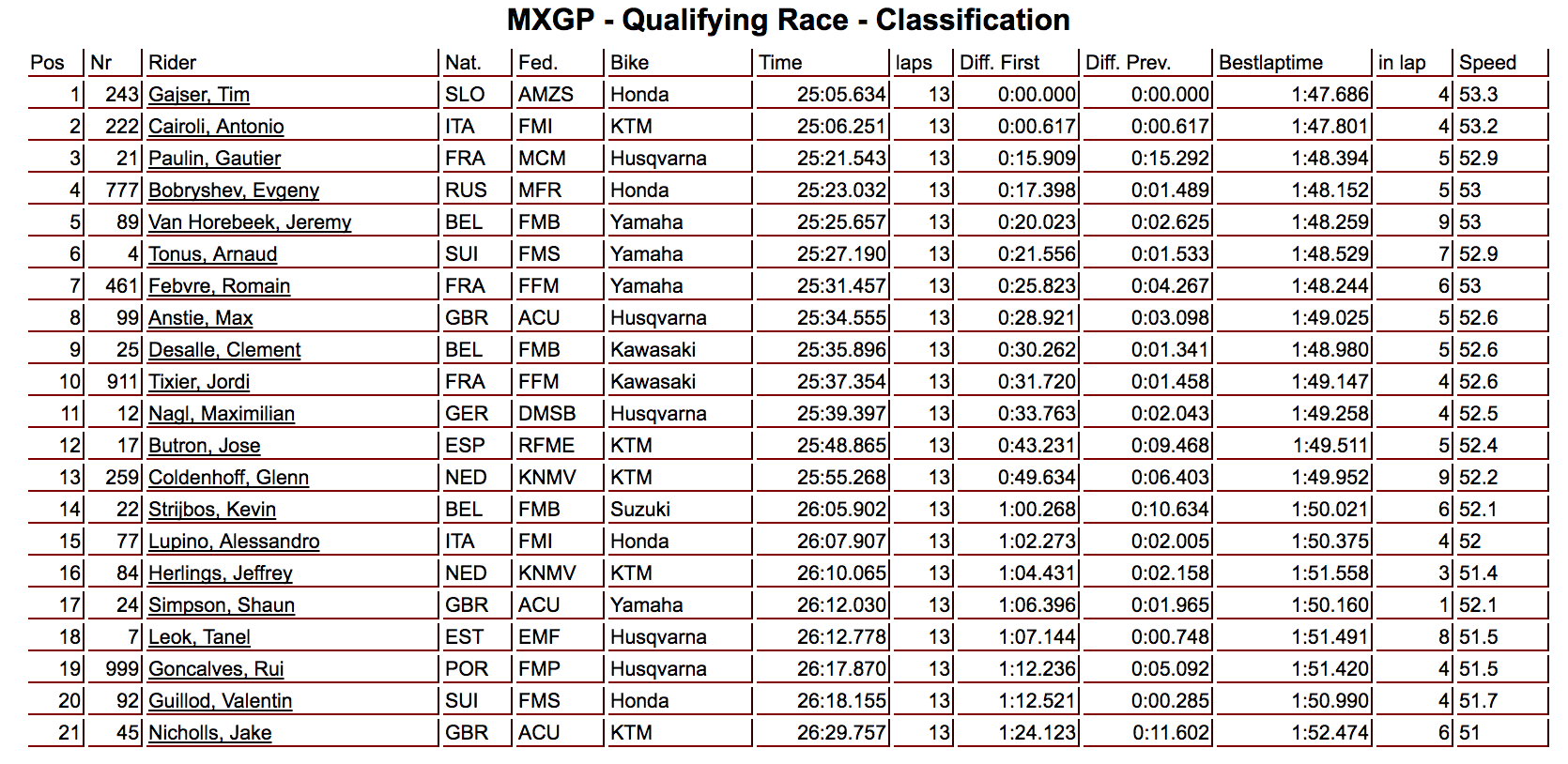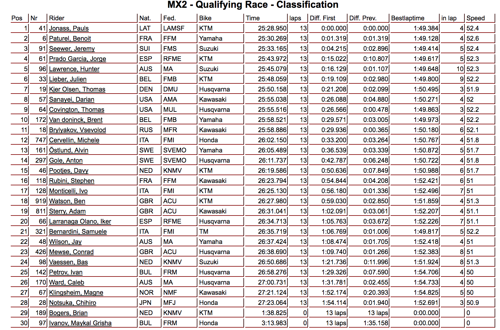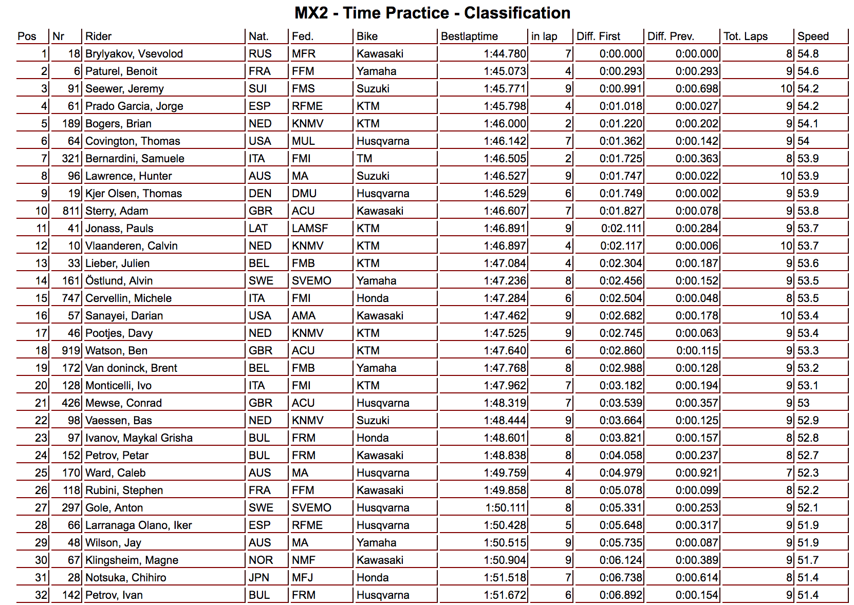 Russian Vsevolod Brylyakov was fastest in MX2, followed by Benoit Paturel and Jeremy Seewer. Pauls Jonass, who set the fastest time in free practice, was 11th.