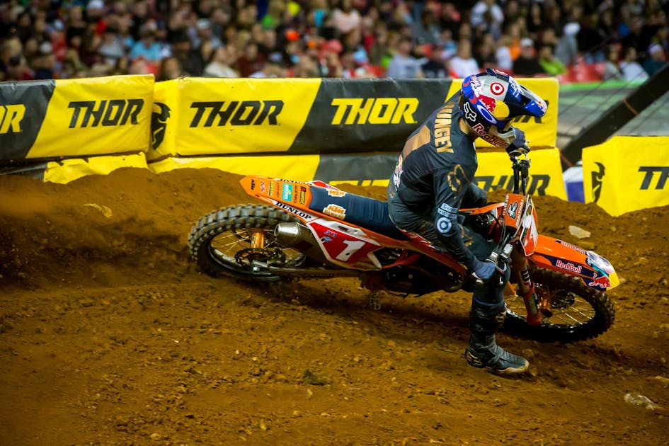 Ain’t nothing changed, apparently, at the front of the pack in Monster Energy Supercross. There might be some riders right now that can out pace or even run down Ryan Dungey on the right nights of Monster Energy Supercross, but he is still able to do what no one else can do consistently, which is nail starts and execute when it counts. With that, Dungey’s run of four “off” (for him) races ended with a big victory in Atlanta, in the final supercross to be run in the Georgia Dome. Dungey grabbed the holeshot and rode steady, and while Eli Tomac made a huge charged from about ninth to second, and then started cutting into Dungey’s lead at the end, it didn’t matter. Dungey got the start when he needed it, Tomac (and others) did not. That’s how Dungey does thigs, and that’s how he’s back up to a massive 25 point (a full race) lead in the standings.