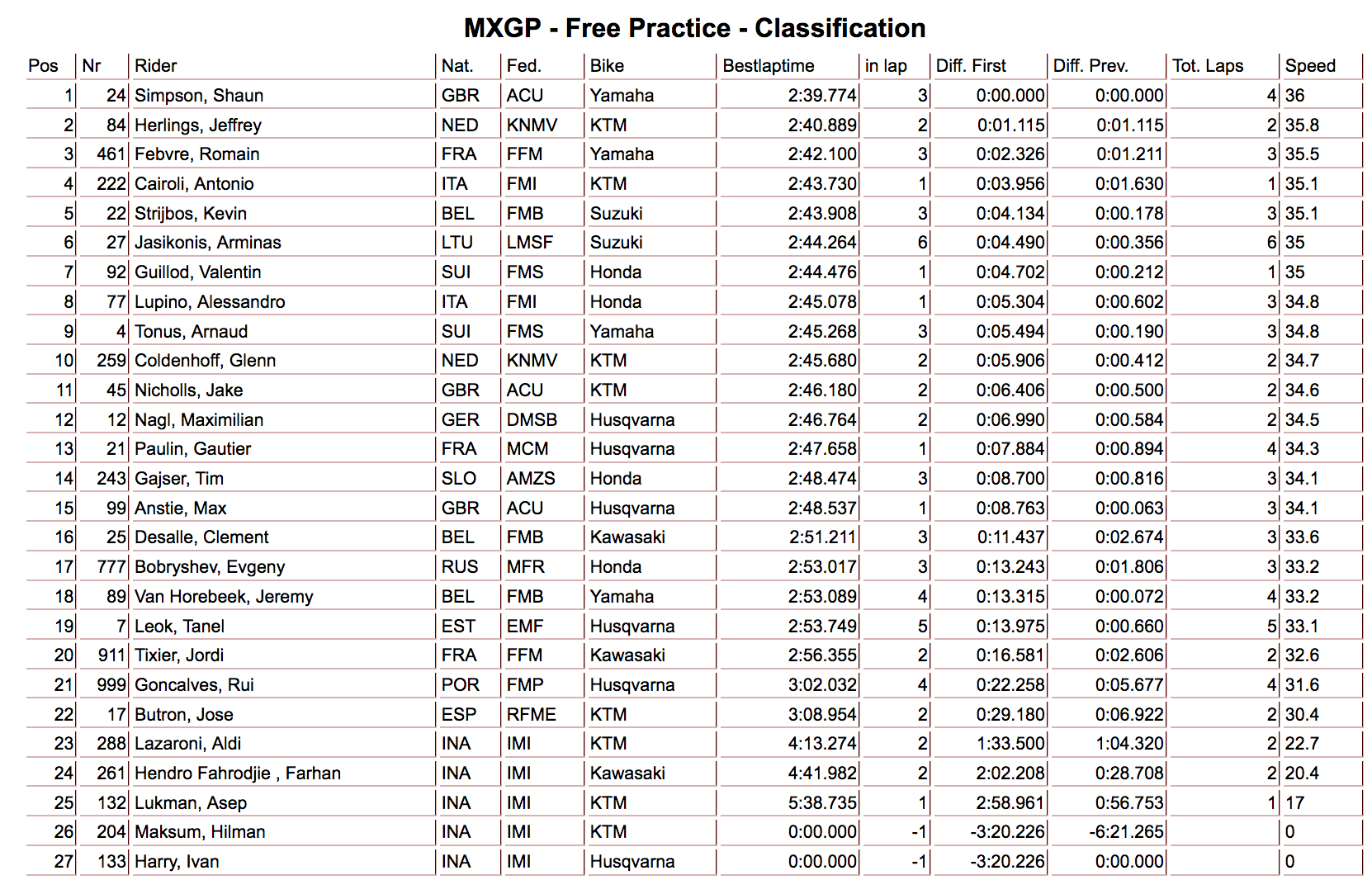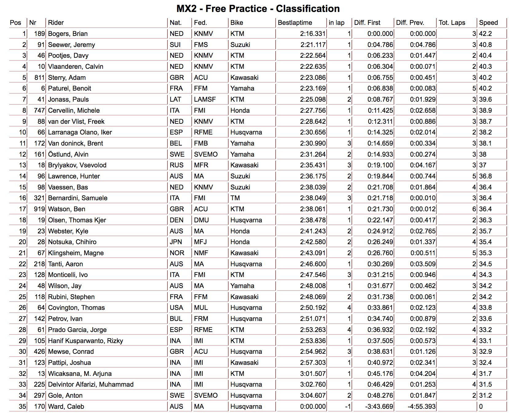 Shaun Simpson’s 2:39.774 set the mark in MXGP, with Jeffrey Herlings, Romain Febvre, Antonio Cairoli and Kevin Strijbos rounding out the top five. MX2 times were much better, with Brian Bogers’ 2:16.331 holding up as the top time. Jeremy Seewer finished second with a time of 2:21.117. Davy Pootjes, Calvin Vlaanderen and Adam Sterry finished inside the top five.
