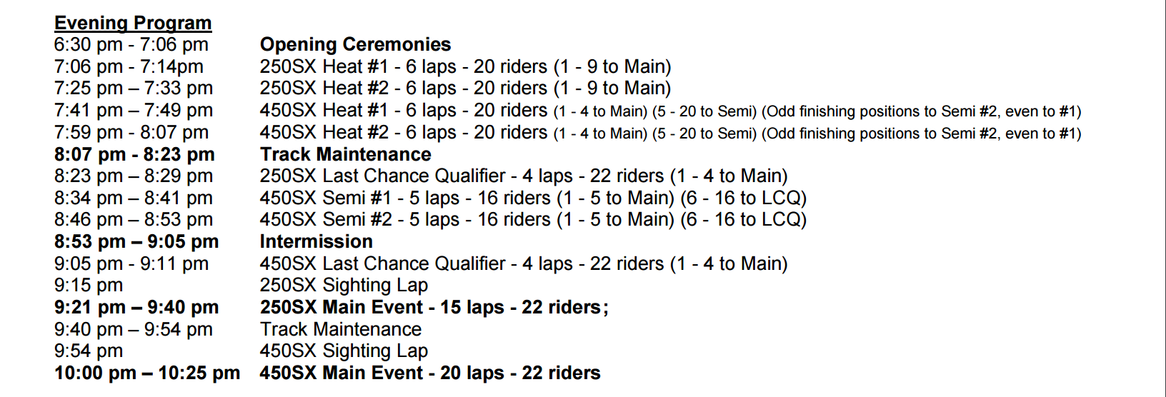 Last year’s 450SX main event race ran 20 laps and was 22:09.070 long. The 250SX main event ran 15 laps and the race time was 17:25.668.