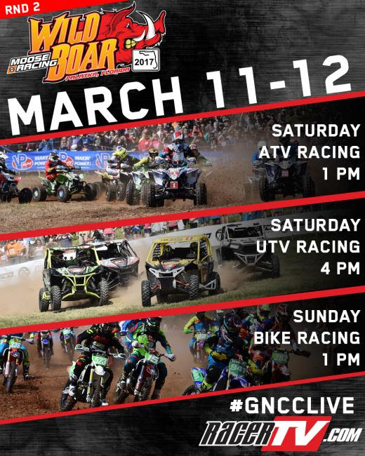 Don't miss the online coverage from Round 2, Moose Racing Wild Boar, of the 2017 Amsoil Grand National Cross Country Series presented by Maxxis, an AMA National Championship this Saturday, March 11, and Sunday, March 12.