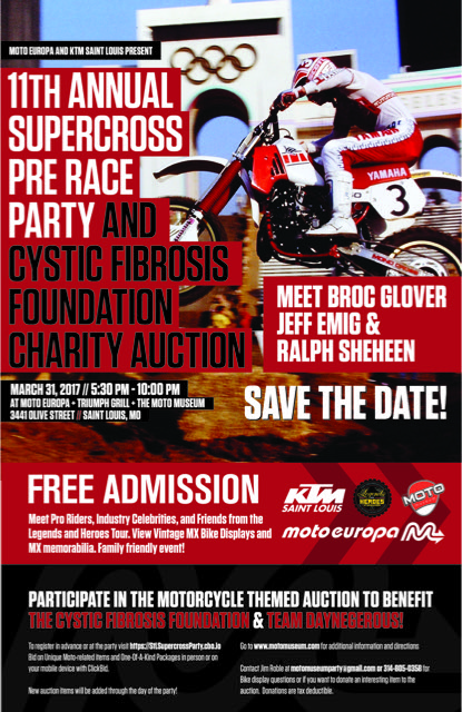 Meet Jeff Emig, Ralph Sheheen, Juliana Daniell, Broc Glover, Rocky Mountain ATV/MC-KTM-WPS riders Davi Milsaps and Blake Baggett, and many other motocross personalities at the St. Louis Supercross Pre-Party and Auction to benefit the Cystic Fibrosis Foundation on Friday, March 31, from 5:30 to 10:00 p.m. at the Moto Museum.