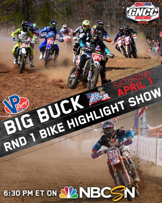 Don't miss the GNCC Bike Highlight show on NBCSN Saturday, April 1 at 6:30 p.m. EST from VP Racing Fuels Big Buck, Round 1 of the 2017 AMSOIL Grand National Cross Country Series presented by Maxxis.