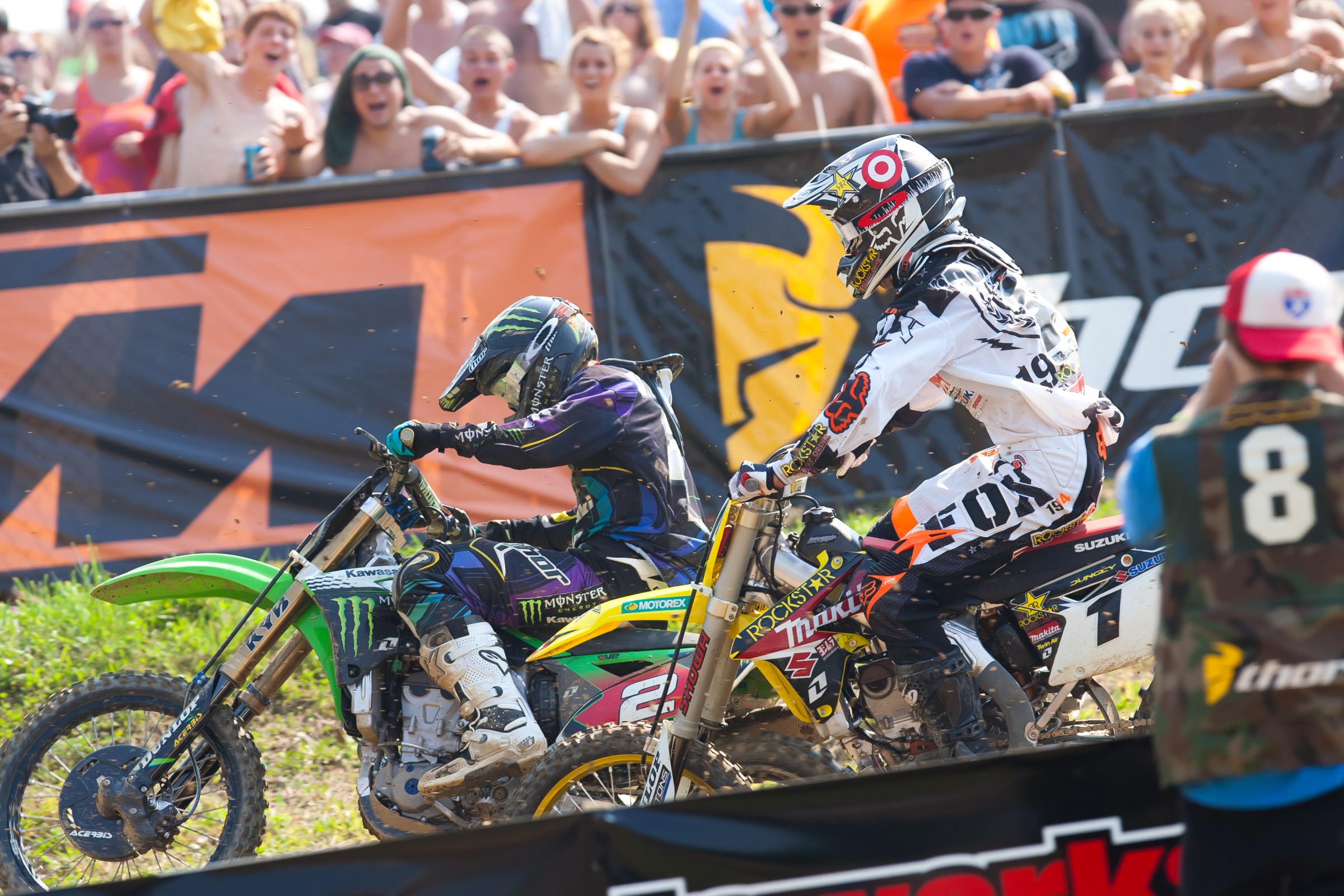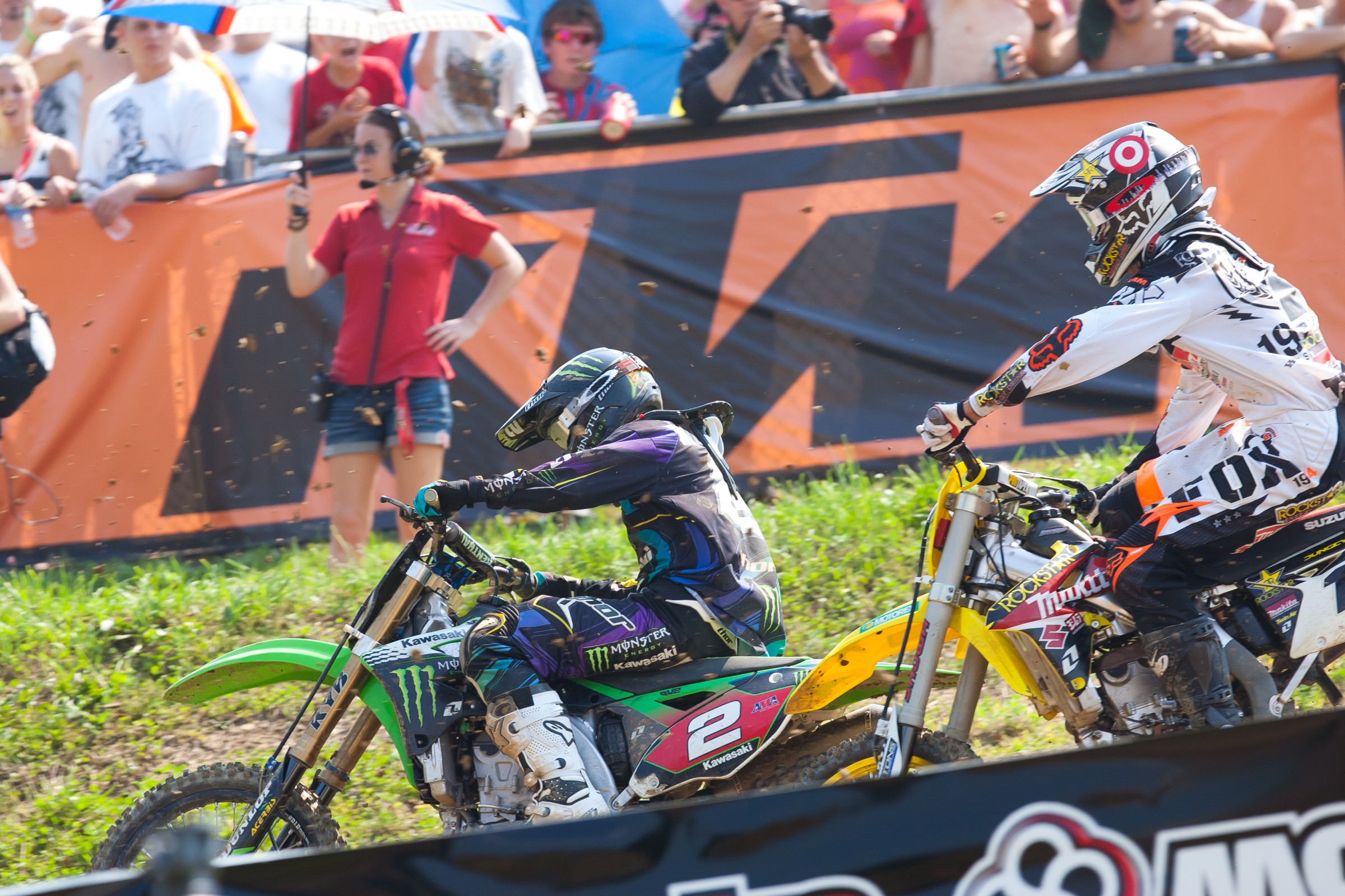 RV shadowed Dungey all the way, but Dungey kept his composure and appeared to be headed for a clutch win. On the last lap, the last turn, Villopoto went wide in a corner, gassed it hard, and pulled even with Dungey. Then Dungey bobbled slightly, allowing Villopoto to pull ahead and take the lead immediately before heading through the finish. Villopoto stole the lead in the last corner, and basically closed the door on the championship.