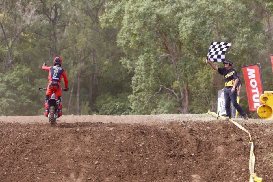 With 30 minutes plus one lap on the clock for the Motul MX2 competitors, by the halfway point riders had settled into their positions—Richardson continuing to lead from Todd and Tanti, while behind them Penrite CRF Honda Racing’s Kyle Webster and Evans were occupying spots four and five. New Zealander Hamish Harwood looked comfortable in sixth position followed by Egan Mastin and Richie Evans.