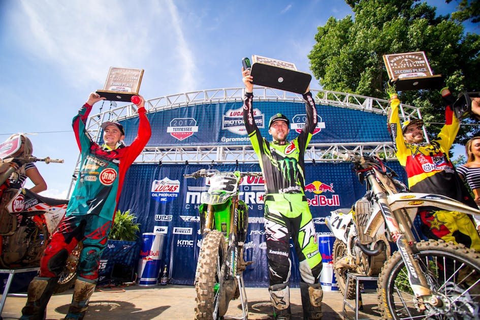 Monster Energy Kawasaki’s Eli Tomac bounced back to the top of the Lucas Oil Pro Motocross Championship podium with a 2-1 at Muddy Creek Raceway’s Tennessee National. Jason Anderson took another swing at his first career overall win by winning moto one on the Rockstar Husqvarna, but Tomac had him covered in moto two. Points leader Blake Baggett had a so-so first moto with a third, but put in a spectacular charge in moto two to come from last to third on his Rocky Mountain-WPS KTM.
