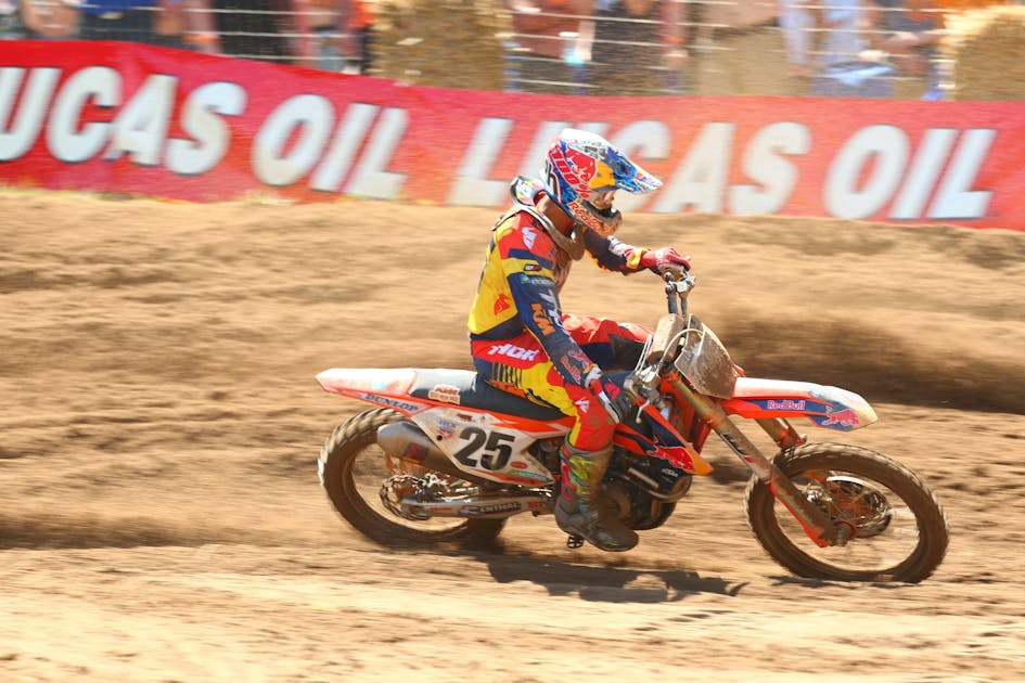 Musquin got cross-rutted up the face of a jump and was launched off the track. He did get back on the bike but pulled into the mechanics area and did not finish the moto.