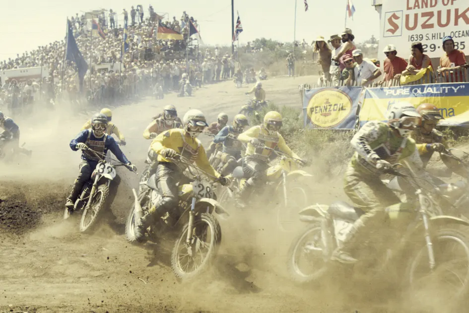 The story of the race begins in 1971, when Southern California (by way of Great Britain) promoter Gavin Trippe lobbied the FIM (Fédération Internationale de Motocyclisme) to bring a round of the 500cc World MX Championship to America. The sport was fairly new here, but the appetite was growing to see European stars like Joel Robert, Roger DeCoster, Adolf Weil, and more. The FIM okayed the event, but not before Trippe did a couple of other international events. So in ’71, the Trans-AMA round scheduled for Carlsbad Raceway was redubbed the First International 500cc Motocross United States Grand Prix. The race had a $15,000 cash purse and included three motos. The winner was Sylvain Geboers on a Suzuki. No FIM World Championship points were awarded.